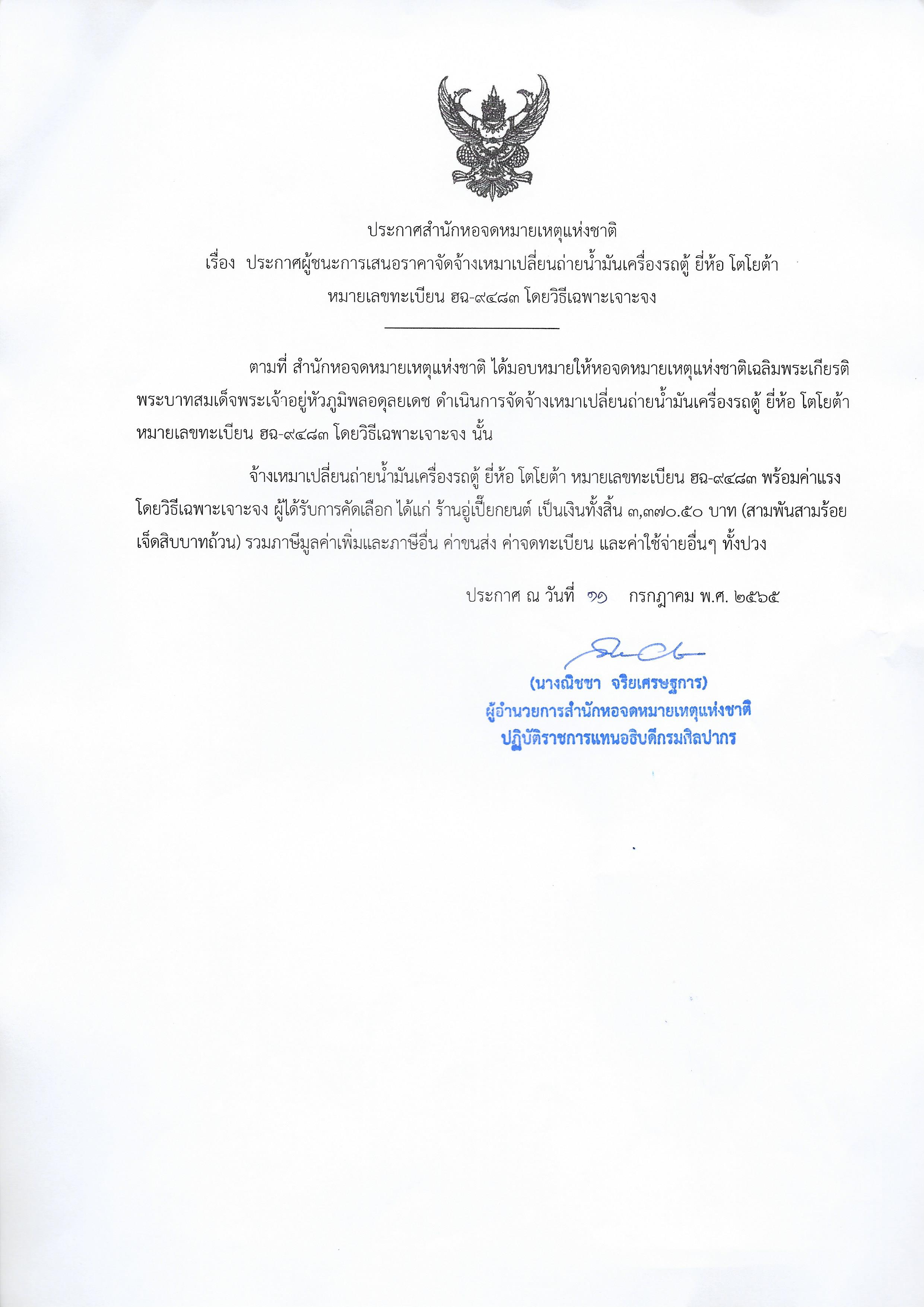 ประกาศสำนักหอจดหมายเหตุแห่งชาติ เรื่อง ประกาศผู้ชนะการเสนอราคาจัดจ้างเหมาเปลี่ยนถ่ายน้ำมันเครื่องรถตู้ ยี่ห้อ โตโยต้า หมายเลขทะเบียน ฮฉ-๙๔๘๓ โดยวิธีเฉพาะเจาะจง