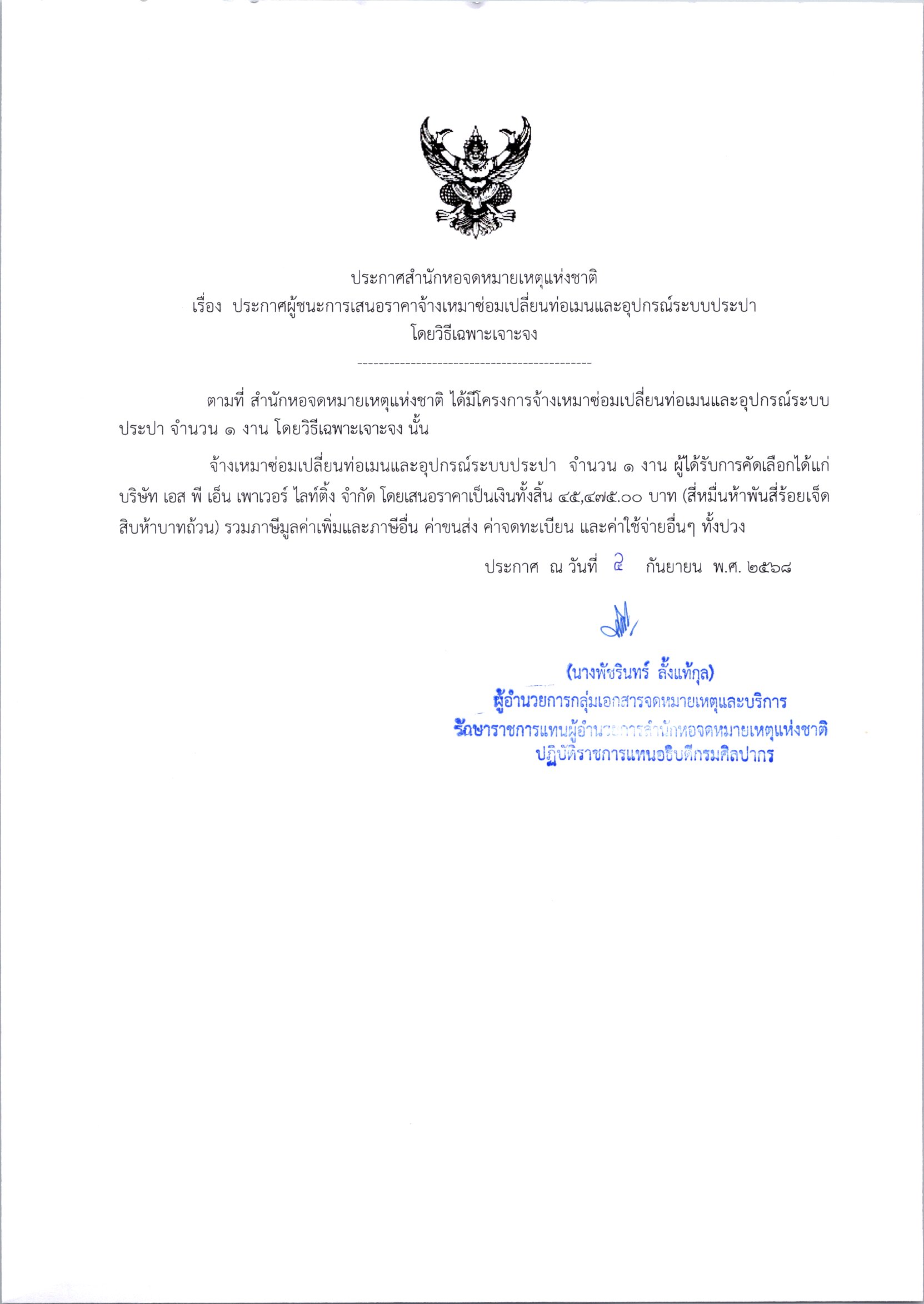 ประกาศสำนักหอจดหมายเหตุแห่งชาติ เรื่องประกาศผู้ชนะการเสนอราคาจ้างเหมาซ่อมเปลี่ยนท่อเมนและอุปกรณ์ระบบประปา โดยวิธีเฉพาะเจาะจง เป็นเงิน 45,475 บาท