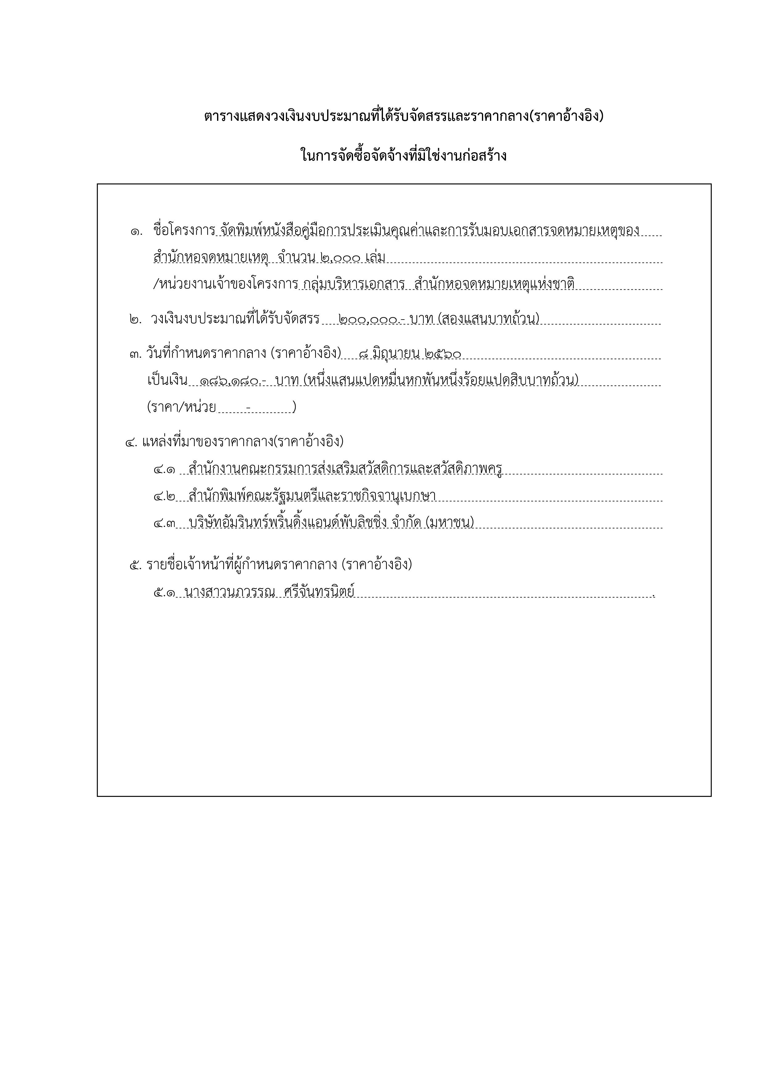 ประกาศตารางแสดงวงเงินงบประมาณที่ได้รับจัดสรรและราคากลาง (ราคาอ้างอิง) โครงการจัดพิมพ์หนังสือคู่มือการประเมินคุณค่าและการรับมอบเอกสารจดหมายเหตุของสำนักหอจดหมายเหตุแห่งชาติ