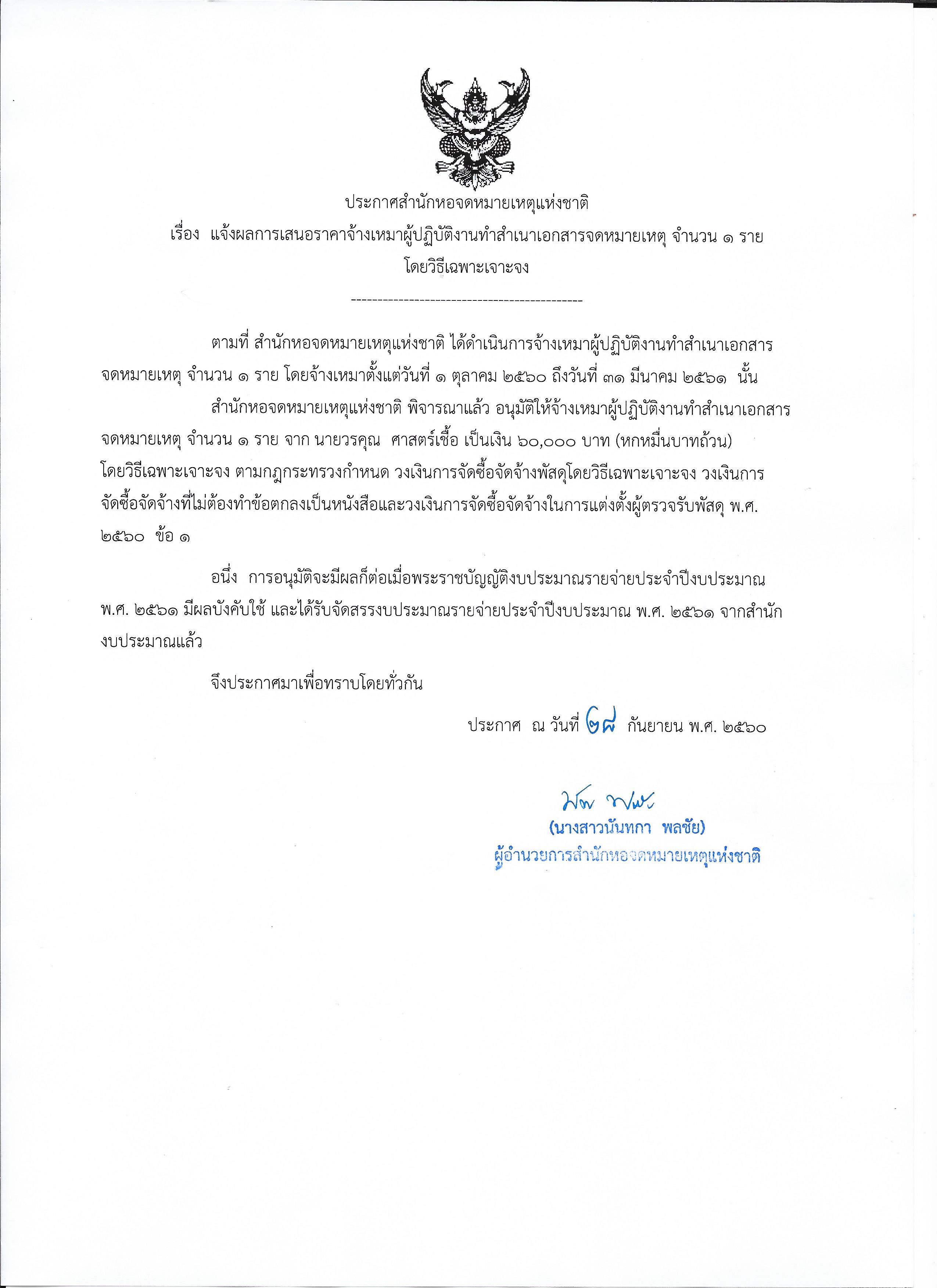 แจ้งผลการเสนอราคาจ้างเหมาผู้ปฏิบัติงานทำสำเนาเอกสารจดหมายเหตุ จำนวน 1 ราย โดยวิธีเฉพาะ