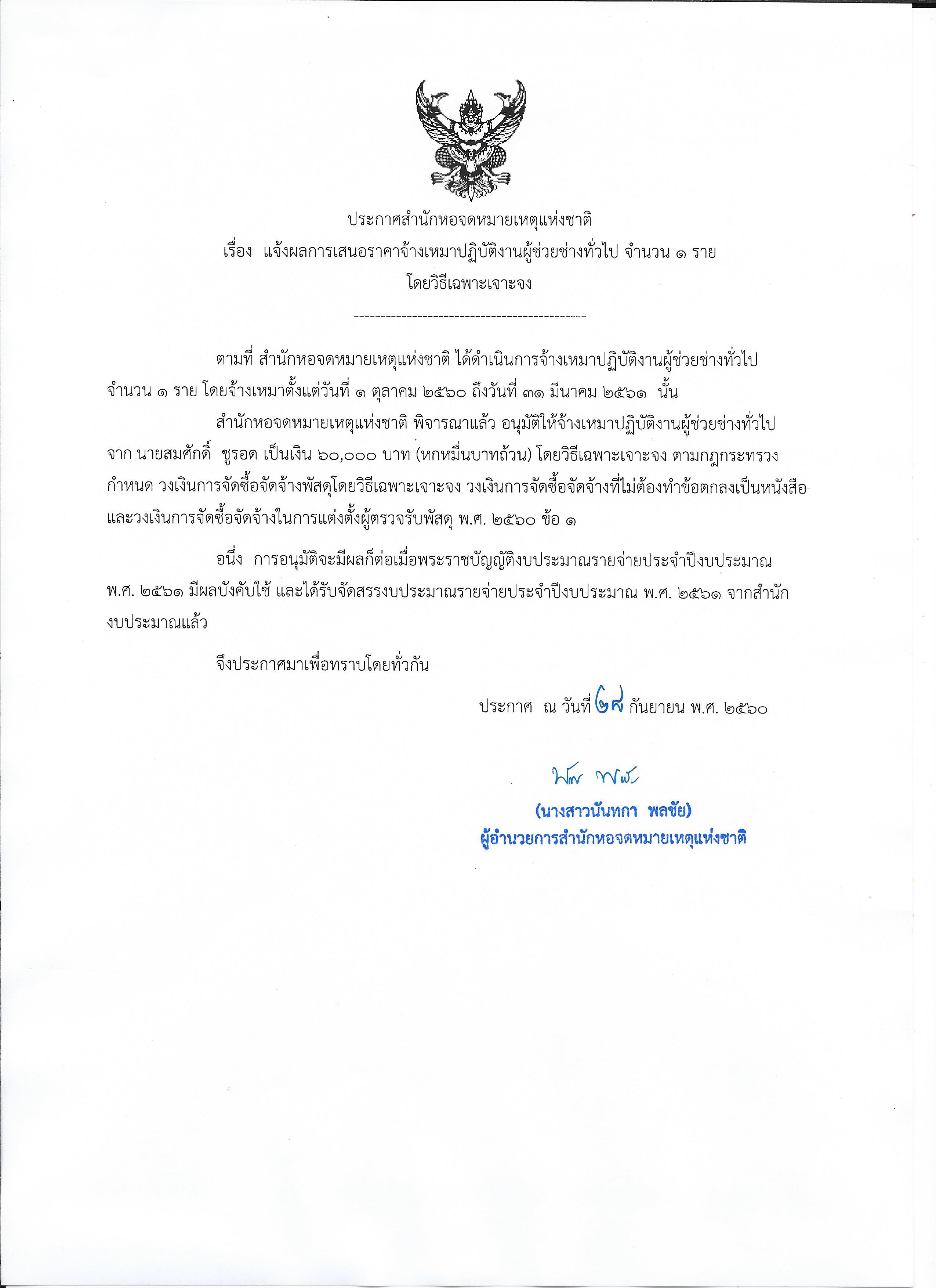 แจ้งผลการเสนอราคาจ้างเหมาปฏิบัติงานผู้ช่วยช่างทั่วไป จำนวน 1 ราย โดยวิธีเฉพาะเจาะจง