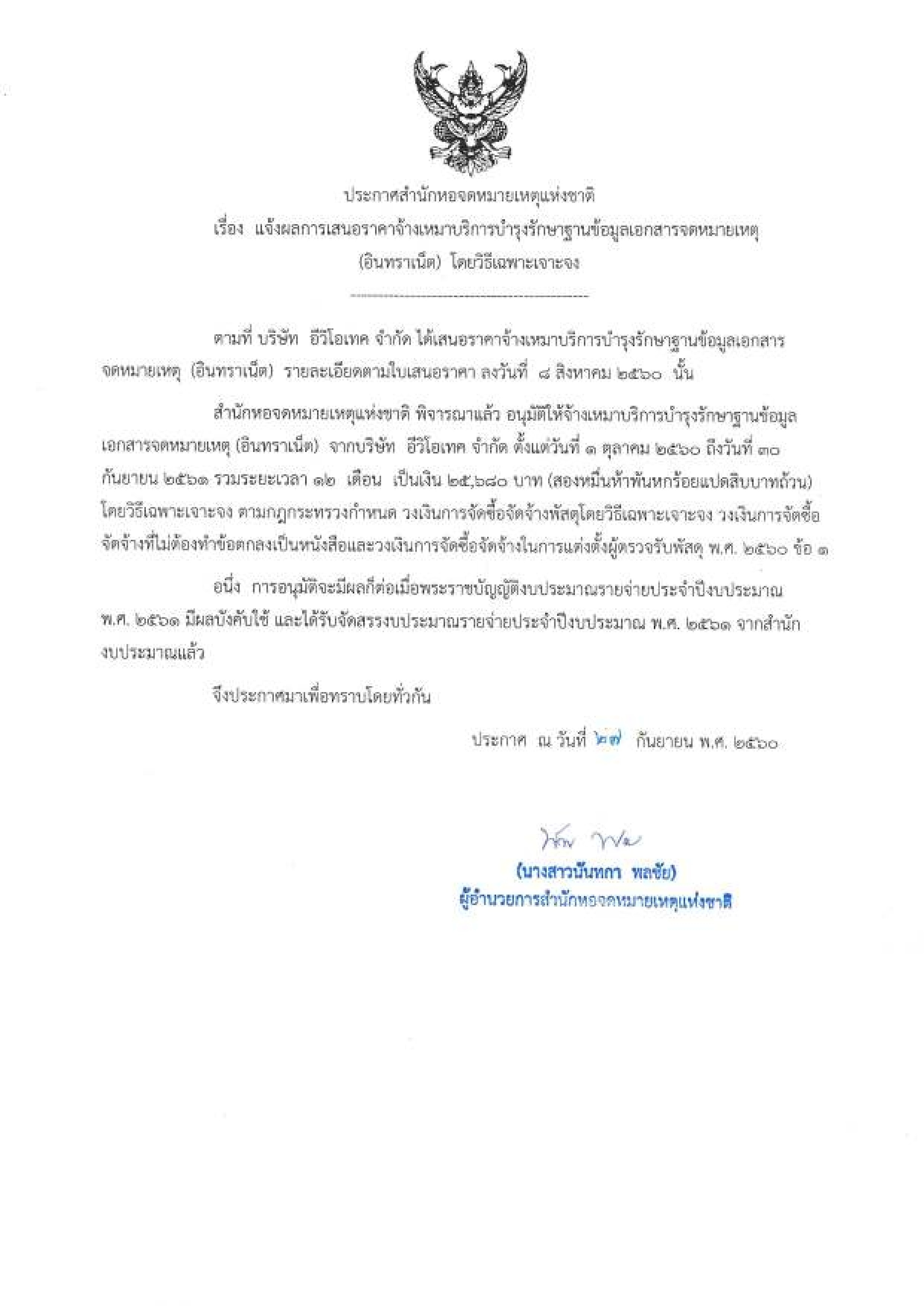 แจ้งผลการเสนอราคาจ้างเหมาบริการบำรุงรักษาฐานข้อมูลเอกสารจดหมายเหตุ (อินทราเน็ต) โดยวิธีเฉพาะเจาะจง
