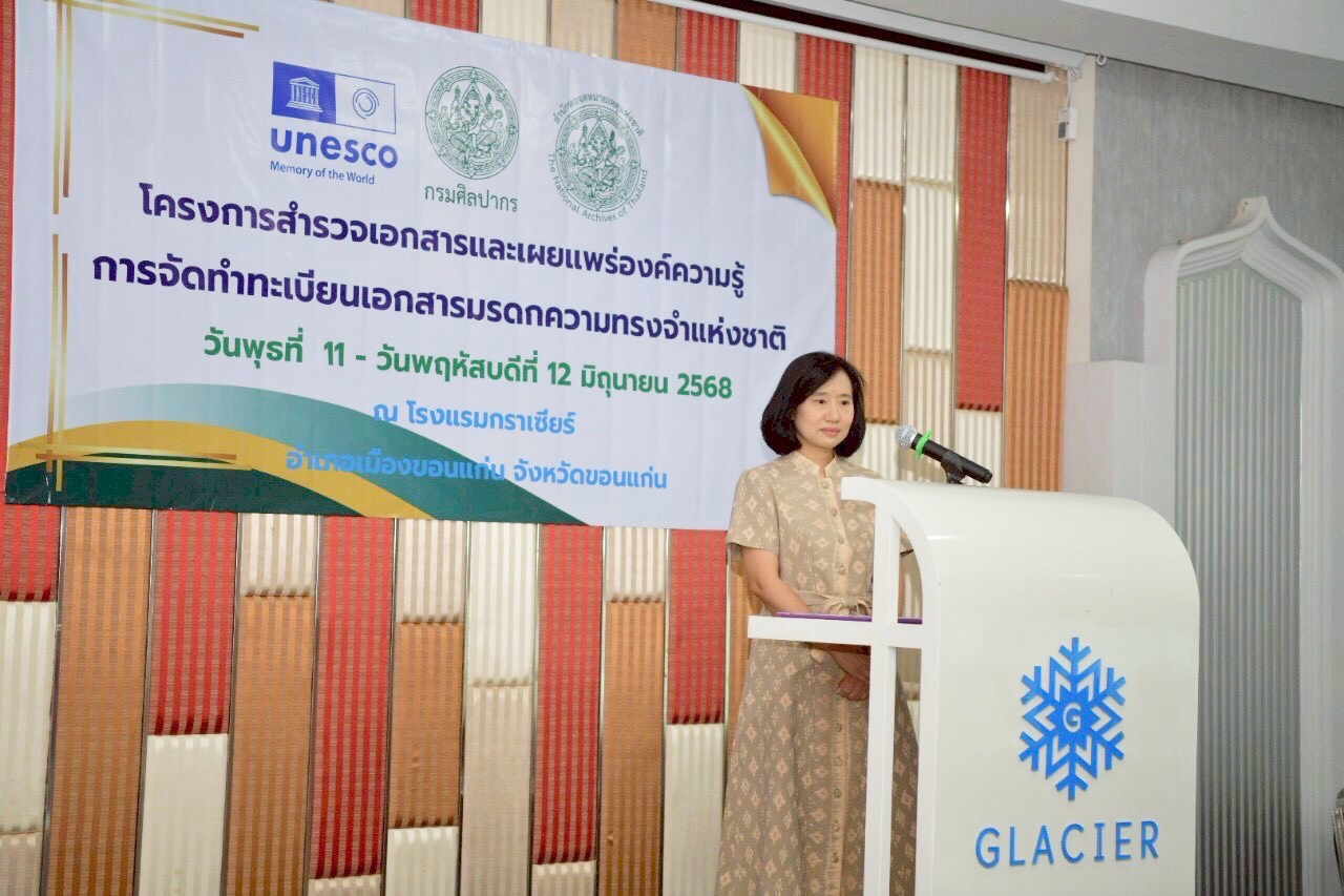 วันที่ 11-12 มิถุนายน 2568 นางสาวกุลริศา รัชตะวุฒิ นักภาษาโบราณ ได้รับมอบหมายจากผู้อำนวยการสำนักศิลปากรที่ 10 นครราชสีมา ให้เข้าร่วมโครงการสำรวจเอกสารและเผยแพร่องค์ความรู้การจัดทำทะเบียนเอกสารมรดกความทรงจำแห่งชาติ ประจำปีงบประมาณ 2568 จัดขึ้นโดยสำนักหอจดหมายเหตุแห่งชาติ โดยมี นางสาวขนิษฐา โชติกวณิชย์ รองอธิบดีกรมศิลปากร เป็นประธานในพิธีเปิด และนายประจวบ รักแพทย์ รองผู้ว่าราชการจังหวัดขอนแก่น กล่าวต้อนรับ ณ ห้องประชุมวินเทอร์ โรงแรมกราเซียร์ จังหวัดขอนแก่น ในการนี้ นายกิตติพงษ์ สนเล็ก ผู้อำนวยการกลุ่มโบราณคดี และนางสาวนภัสสร แย้มคงเมือง นักโบราณคดีปฏิบัติการ สำนักศิลปากรที่ 10 นครราชสีมา เข้าร่วมโครงการฯ ด้วย