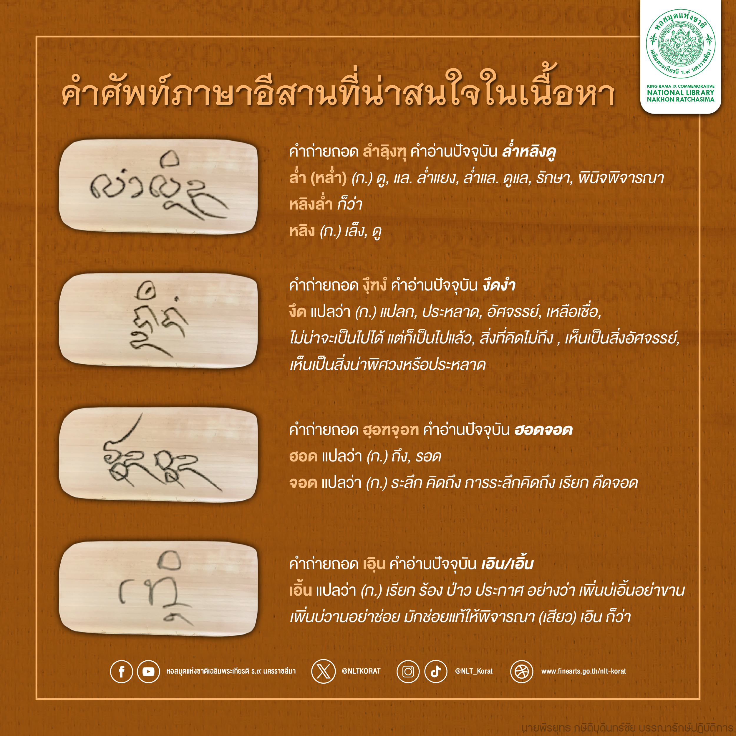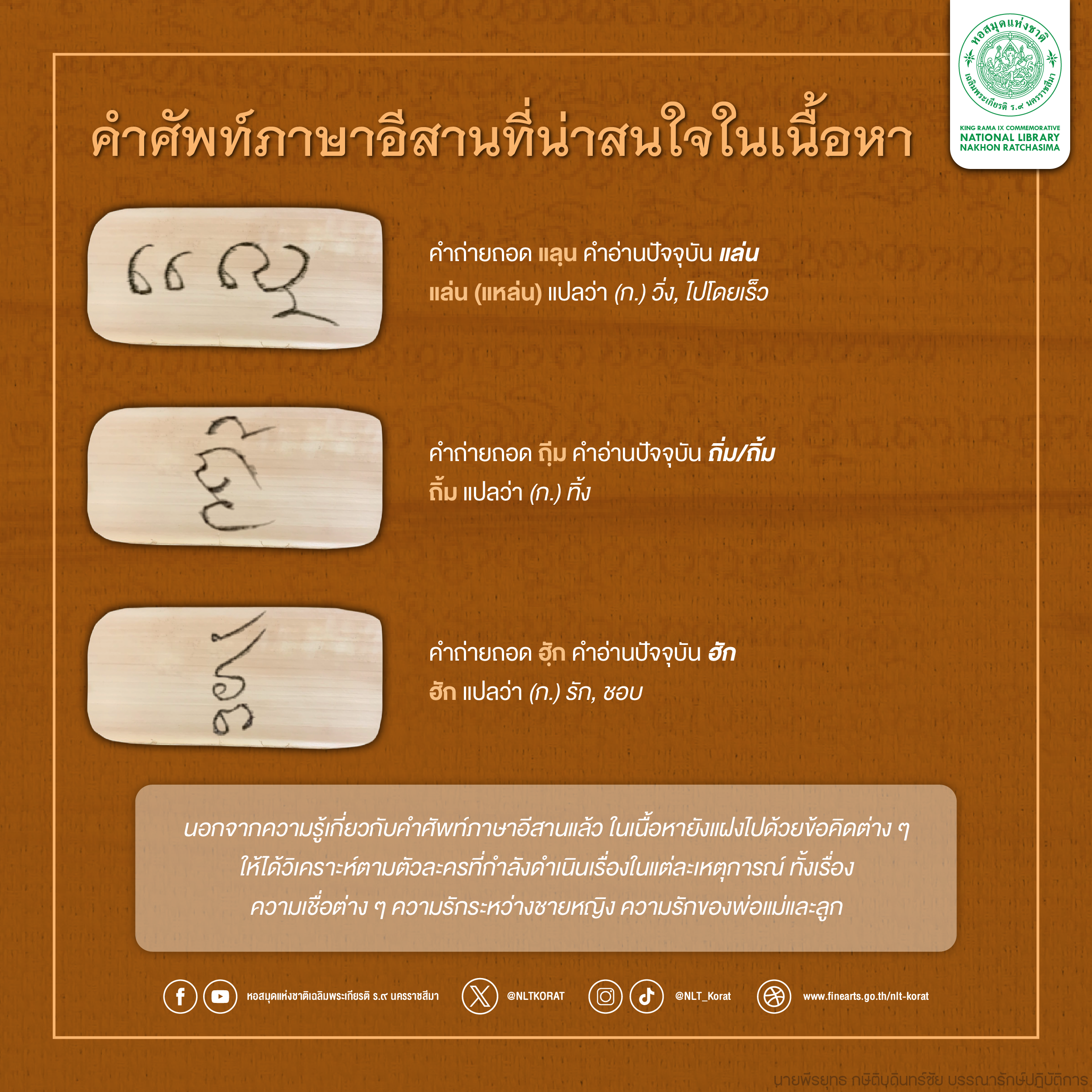 เพื่อเพิ่มอรรถรสในการอ่านและเพิ่มความเข้าใจของเนื้อหา จึงได้นำคำศัพท์ภาษาอีสานที่ปรากฏในเนื้อหามาให้ผู้อ่านได้ศึกษา จะมีคำใดบ้างนั้นไปดูกันเลยค่ะ