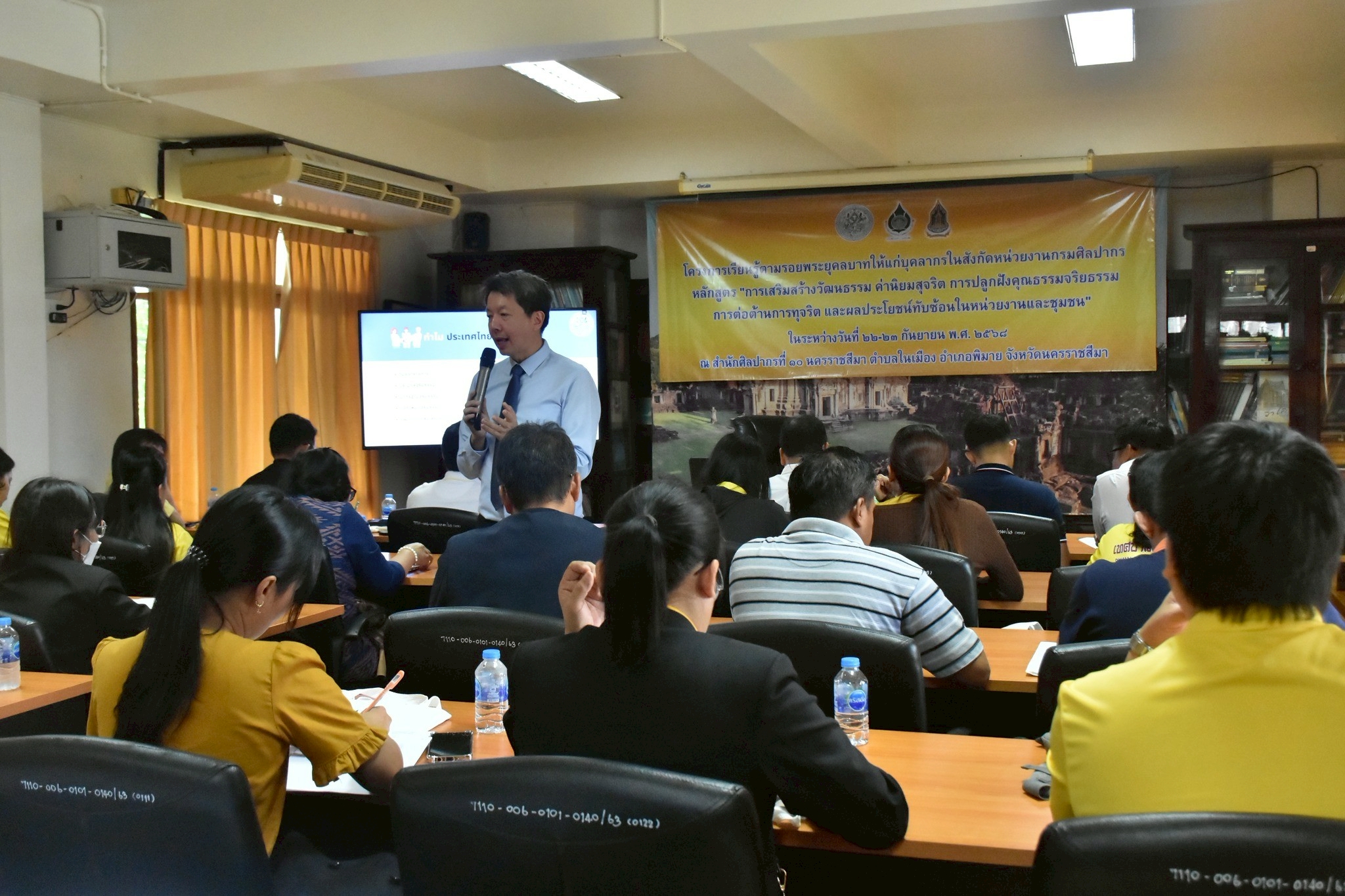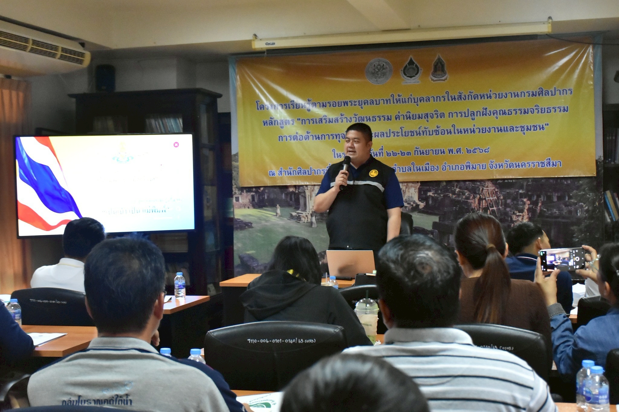 วันที่ 22 - 23 กันยายน 2568 นางพัชมณ ศรีสัตย์รสนา ผู้อำนวยการหอสมุดแห่งชาติเฉลิมพระเกียรติ ร.๙ นครราชสีมา พร้อมด้วยนายมานพ วงษ์มี เจ้าพนักงานธุรการชำนาญงาน และนายวรธน พึ่งเฮง เจ้าพนักงานห้องสมุดปฏิบัติงาน เข้าร่วมโครงการเรียนรู้ตามรอยพระยุคลบาทฯ หลักสูตร “การเสริมสร้างวัฒนธรรม ค่านิยมสุจริต การปลูกฝังคุณธรรม จริยธรรม การต่อต้านการทุจริต และผลประโยชน์ทับซ้อนในหน่วยงานและชุมชน” โดยมีนายเจษฎา ชีวะวิชวาลกุล รองอธิบดีกรมศิลปากร เป็นประธานในพิธีเปิด และนายทศพร ศรีสมาน ผู้อำนวยการสำนักศิลปากรที่ 10 นครราชสีมา เป็นผู้กล่าวรายงาน ณ ห้องประชุมสํานักศิลปากรที่ 10 นครราชสีมา อำเภอพิมาย จังหวัดนครราชสีมา