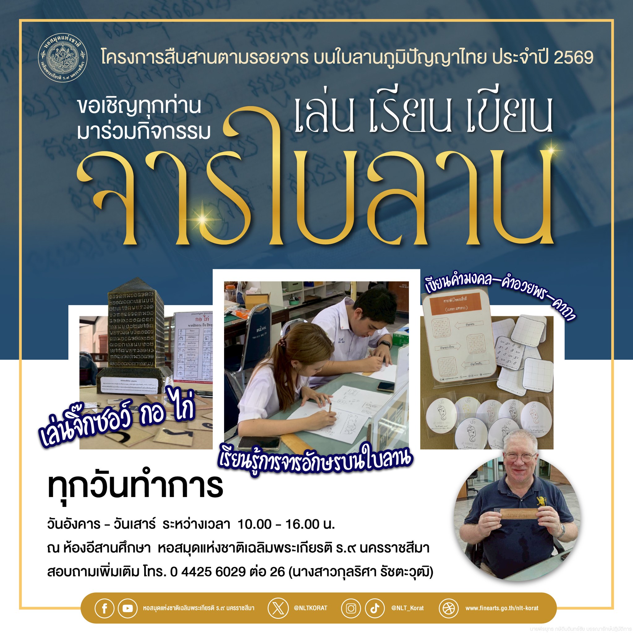 หอสมุดขอเชิญชวนทุกท่านมาสัมผัสเสน่ห์อักษรโบราณผ่านกิจกรรมเล่น เรียน เขียน จารใบลาน