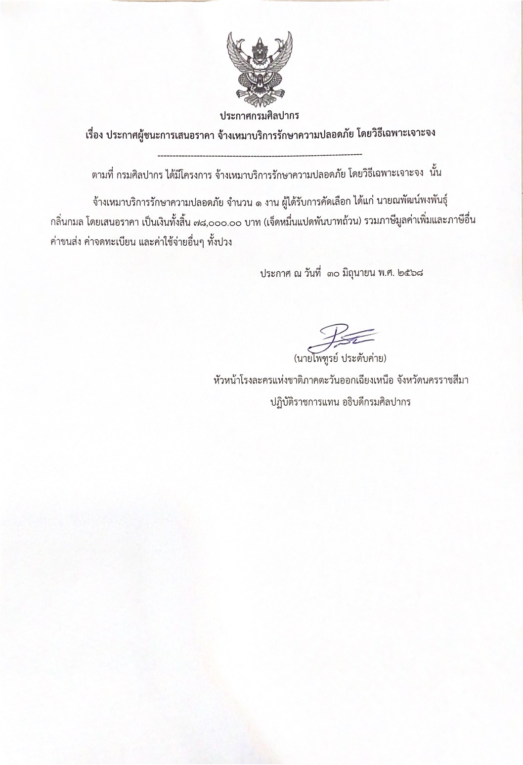 ประกาศผู้ชนะการเสนอราคา จ้างเหมาบริการรักษาความปลอดภัย โดยวิธีเฉพาะเจาะจง (มิถุนายน 2568)