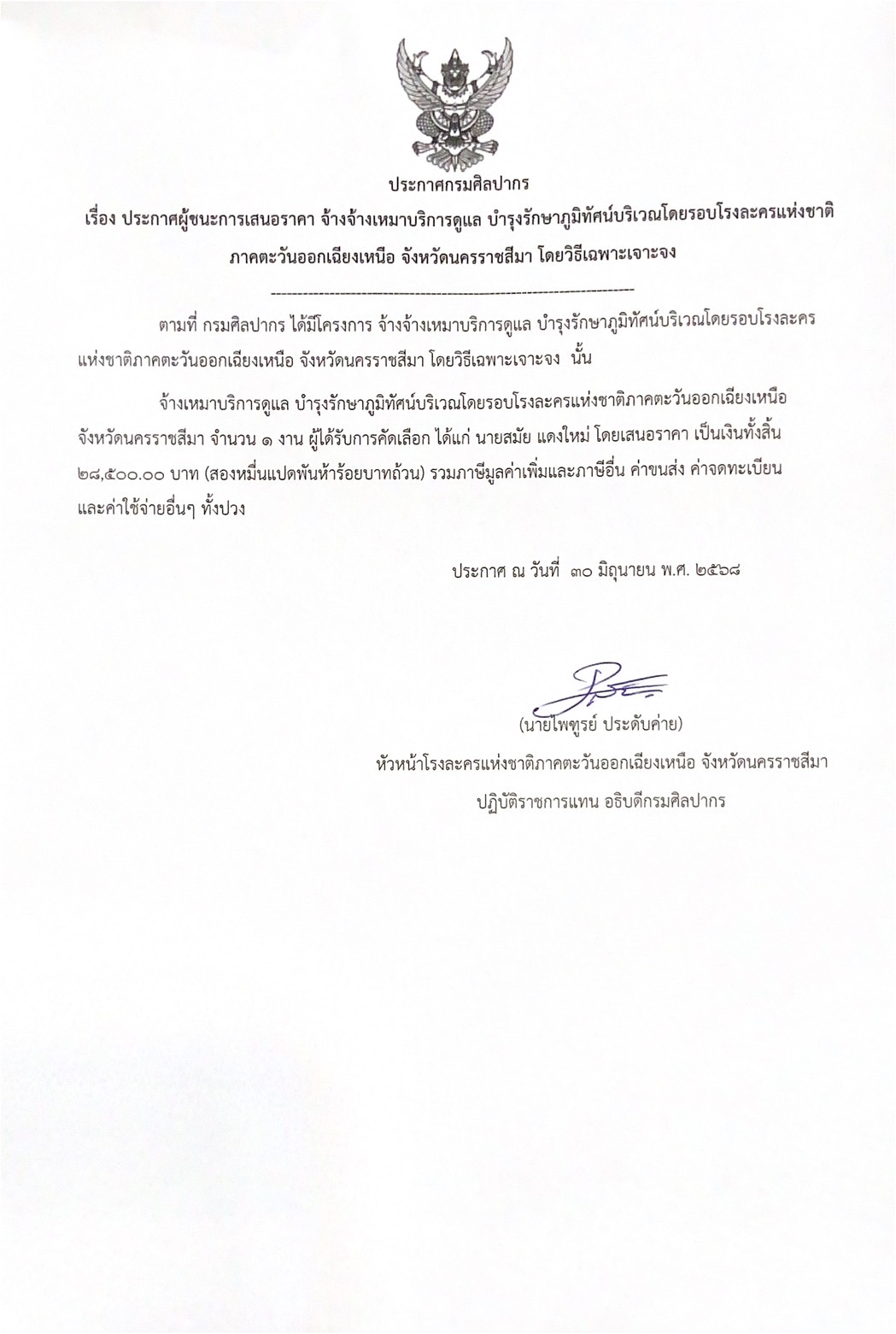 ประกาศผู้ชนะการเสนอราคา จ้างเหมาบริการดูแล บำรุงรักษาภูมิทัศน์บริเวณโดยรอบโรงละคร ฯ โดยวิธีเฉพาะเจาะจง (มิถุนายน 2568)