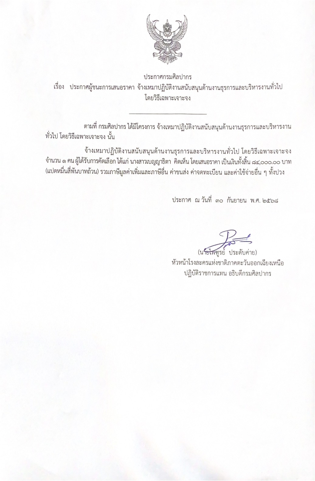 ประกาศผู้ชนะการเสนอราคา จ้างเหมาปฏิบัติงานสนับสนุนด้านงานธุรการและบริหารงานทั่วไป นางสาวเบญญาธิตา คิดเห็น
