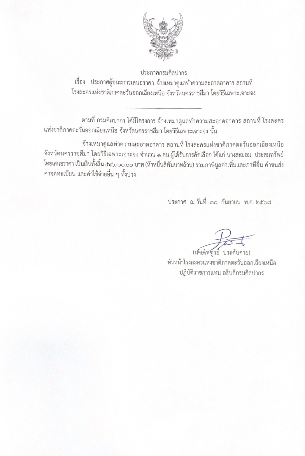 ประกาศผู้ชนะการเสนอราคา จ้างเหมาดูแลทำความสะอาดอาคาร สถานที่ โรงละครฯ นางละม่อม ประสมทรัพย์