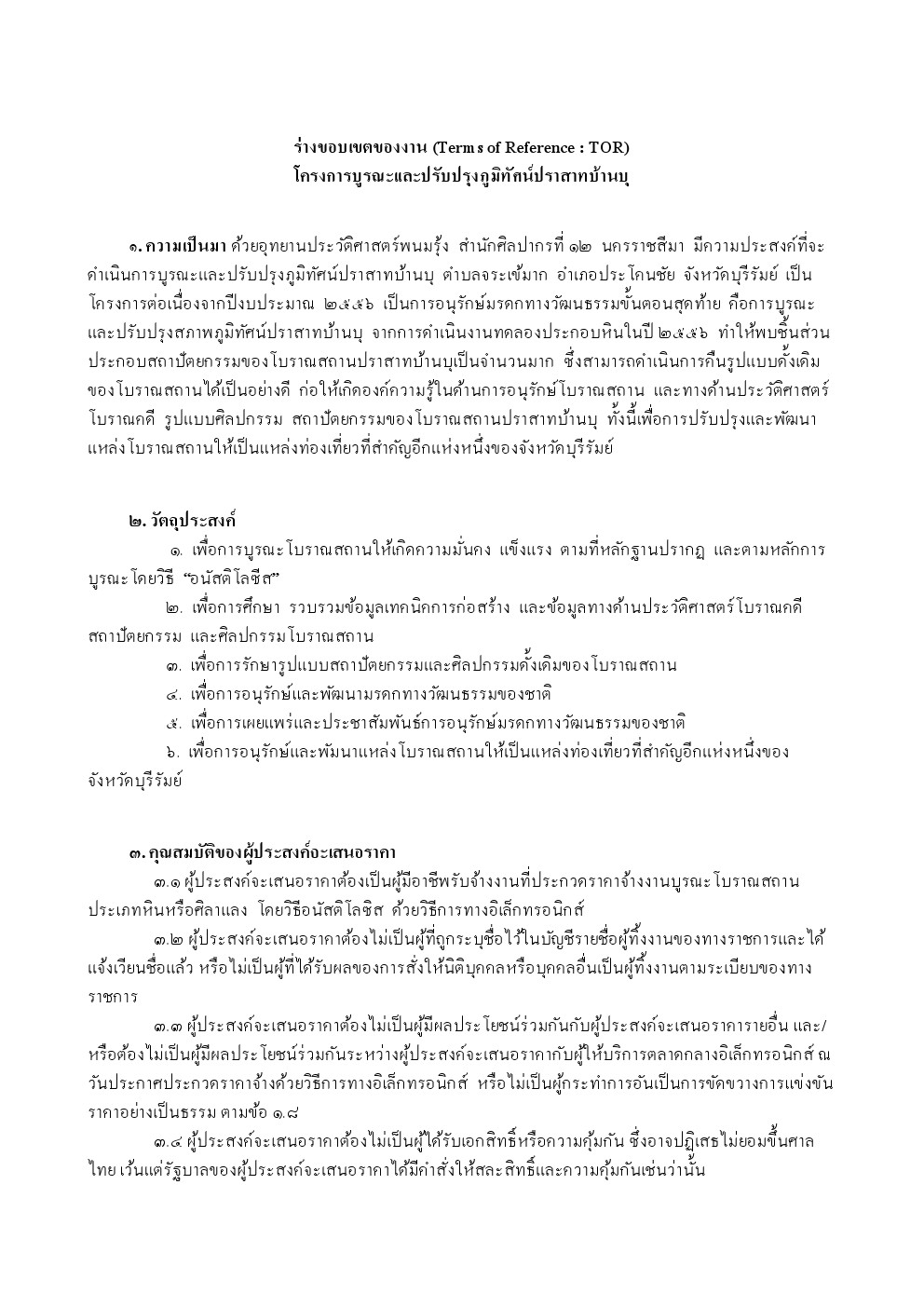 ประกาศร่าง TOR Files - ร่างขอบเขตของงาน (Terms of Reference : TOR) โครงการบูรณะและปรับปรุงภูมิทัศน์ปราสาทบ้านบุ
