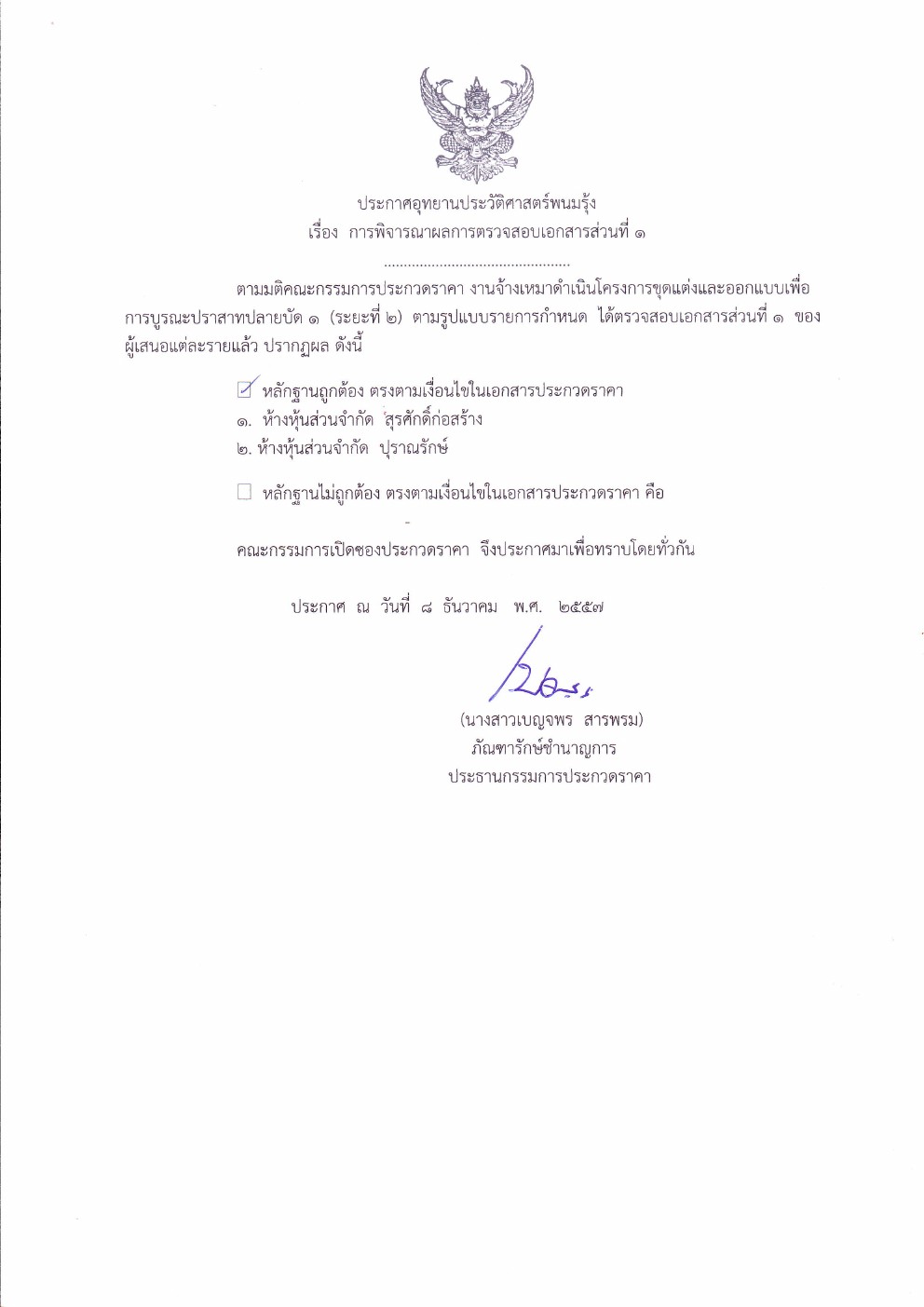 ประกาศ เรื่องผู้เสนอราคาที่ผ่านการตรวจสอบเอกสารที่ ๑ และไม่เป็นผู้เสนอราคาที่มีผลประโยชน์ร่วมกันของโครงการขุดแต่งและออกแบบเพื่อการบูรณะปราสาทปลายบัด ๑