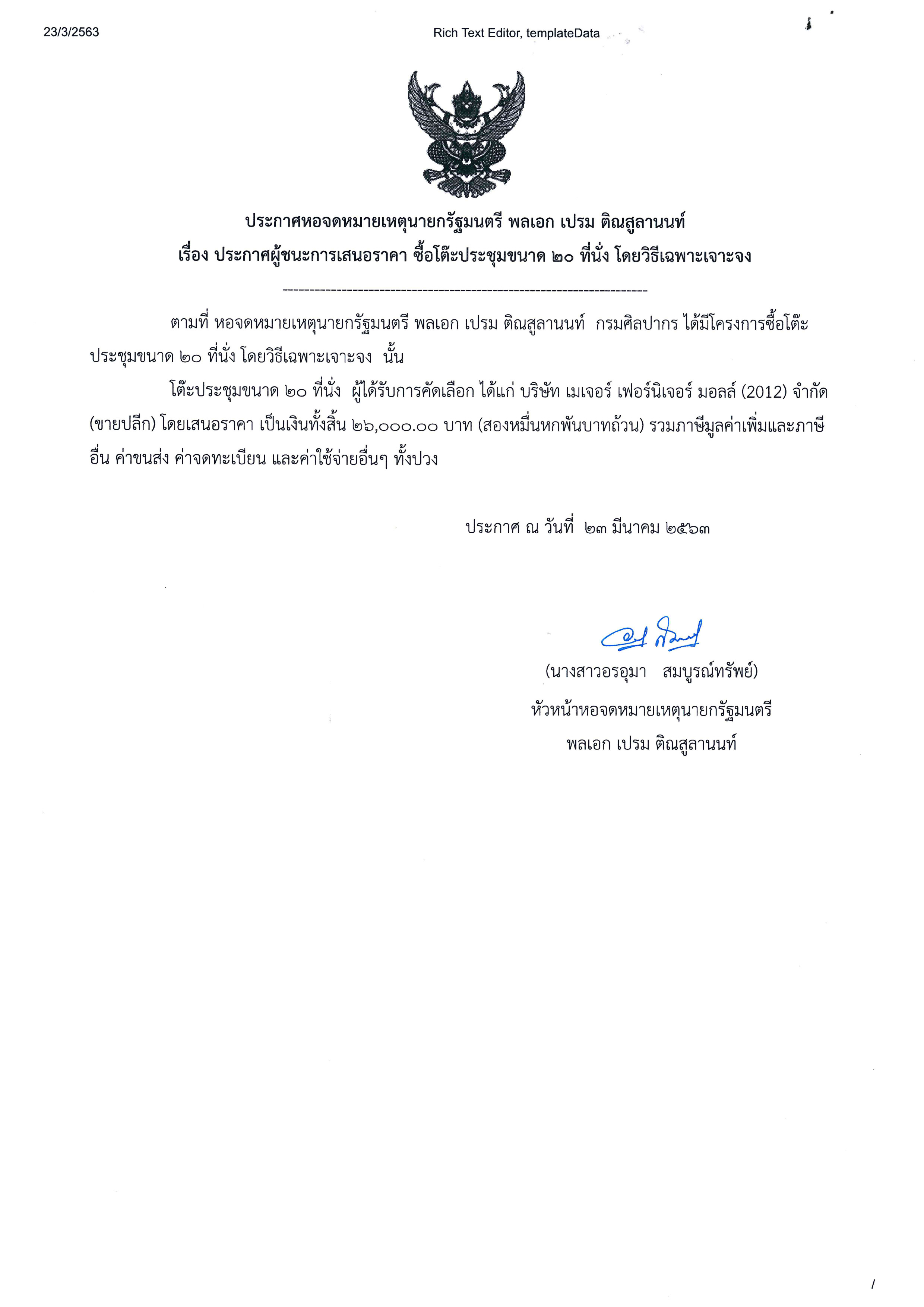 ประกาศผู้ชนะการเสนอราคา ประกาศผู้ชนะการเสนอราคา ซื้อโต๊ะประชุมขนาด 20 ที่นั่ง โดยวิธีเฉพาะเจาะจง