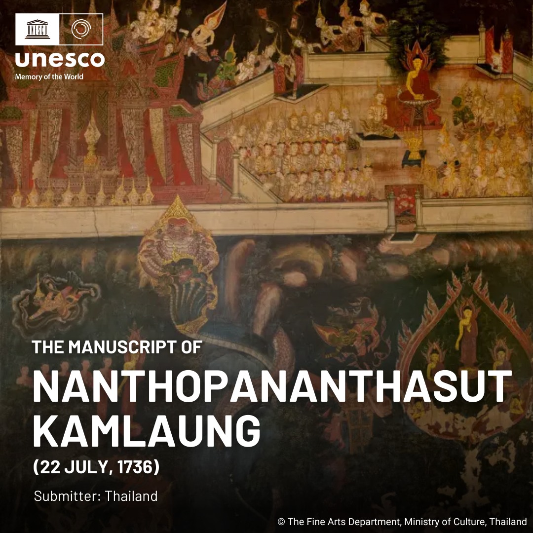 นางสาวสุดาวรรณ หวังศุภกิจโกศล รัฐมนตรีว่าการกระทรวงวัฒนธรรม กล่าวว่า ได้รับรายงานจากกรมศิลปากรว่าเมื่อวันที่ 17 เมษายน 2568 ที่ผ่านมา องค์การเพื่อการศึกษาวิทยาศาสตร์ และวัฒนธรรมแห่งสหประชาชาติ หรือยูเนสโก ได้ประกาศมรดกความทรงจำแห่งโลก (Memory of the World) ประจำปี 2568 จำนวน 74 รายการ โดยมีเอกสารจากประเทศไทยได้รับการขึ้นทะเบียนมรดกความทรงจำแห่งโลก จำนวน 3 รายการ ได้แก่ รายการที่ 1 เอกสารสมุดไทย นันโทปนันทสูตรคำหลวง (The Manuscript of Nanthopananthasut Kamlaung) เอกสารโบราณล้ำค่าของไทย เป็นวรรณคดีทางพระพุทธศาสนาที่เจ้าฟ้าธรรมธิเบศรไชยเชษฐสุริยวงศ์ (เจ้าฟ้ากุ้ง) ทรงพระนิพนธ์ขึ้นเมื่อปี 2279 ซึ่งเก็บรักษาไว้ที่หอสมุดแห่งชาติ กรมศิลปากร