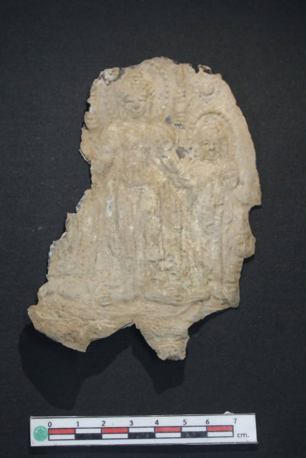 ภาพ : แผ่นตะกั่วหรือชินดุนรูปพระพุทธรูปประทับยืนพร้อมพระสาวก