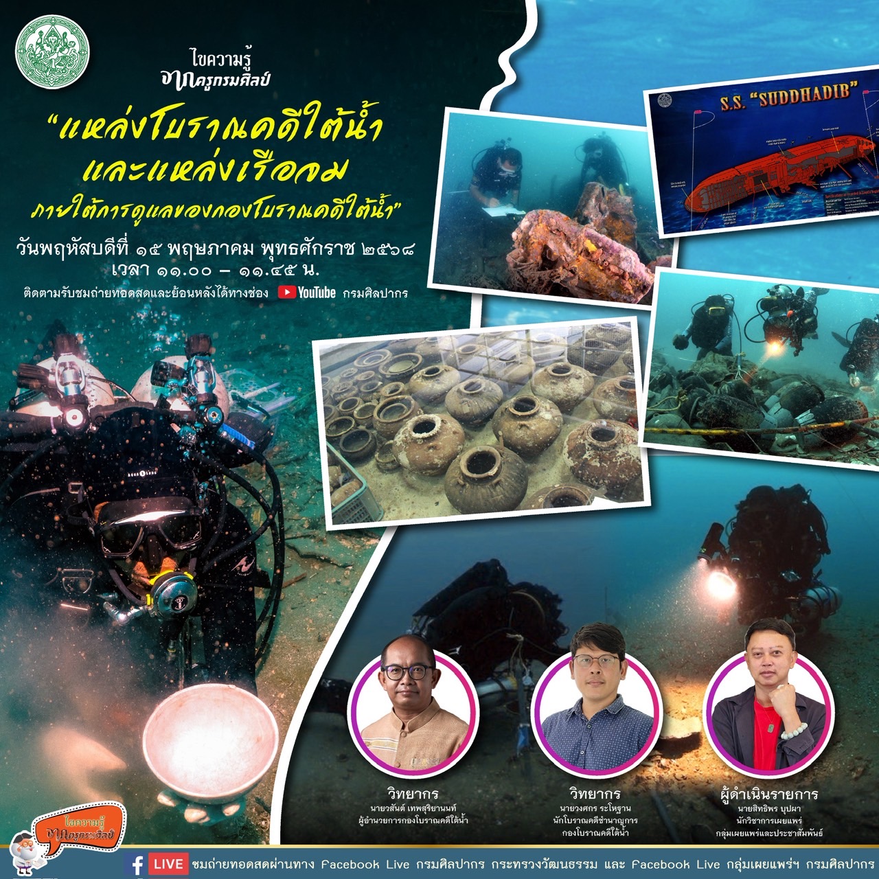 ขอเชิญชม Facebook Live รายการไขความรู้จากครูกรมศิลป์ “แหล่งโบราณคดีใต้น้ำและแหล่งเรือจมภายใต้การดูแลของกองโบราณคดีใต้น้ำ”