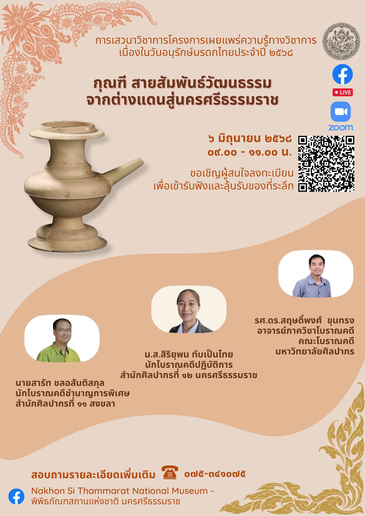 พิพิธภัณฑสถานแห่งชาติ นครศรีธรรมราช ขอเชิญร่วมรับฟังการเสวนาวิชาการโครงการเผยแพร่ความรู้เนื่องในวันอนุรักษ์มรดกไทย ประจำปี ๒๕๖๘ เรื่อง "กุณฑี สายสัมพันธ์วัฒนธรรมจากต่างแดนสู่นครศรีธรรมราช" วิทยากรโดย นายสารัท ชลอสันติสกุล นักโบราณคดีชำนาญการพิเศษ สำนักศิลปากรที่ ๑๑ สงขลา นางสาวสิริยุพน ทับเป็นไทย นักโบราณคดีปฏิบัติการ สำนักศิลปากรที่ ๑๒ นครศรีธรรมราช และ รศ.ดร.สฤษดิ์พงศ์ ขุนทรง อาจารย์ภาควิชาโบราณคดี คณะโบราณคดี มหาวิทยาลัยศิลปากร วันศุกร์ที่ ๖ มิถุนายน ๒๕๖๘ เวลา ๐๙.๐๐ - ๑๑.๐๐ น. รับชมได้ผ่านทางแอพพลิเคชั่น Zoom และ Facebook LIVE ผู้สนใจสามารถลงทะเบียนเข้าร่วมฟังและลุ้นรับของที่ระลึก โดยสแกนคิวอาร์โค้ด หรือคลิกที่นี่ https://forms.gle/7nDXWonHXqxJHDqK9 สอบถามเพิ่มเติม โทร.๐ ๗๕๓๔ ๑๐๗๕(จำนวนผู้เข้าชม 234 ครั้ง)