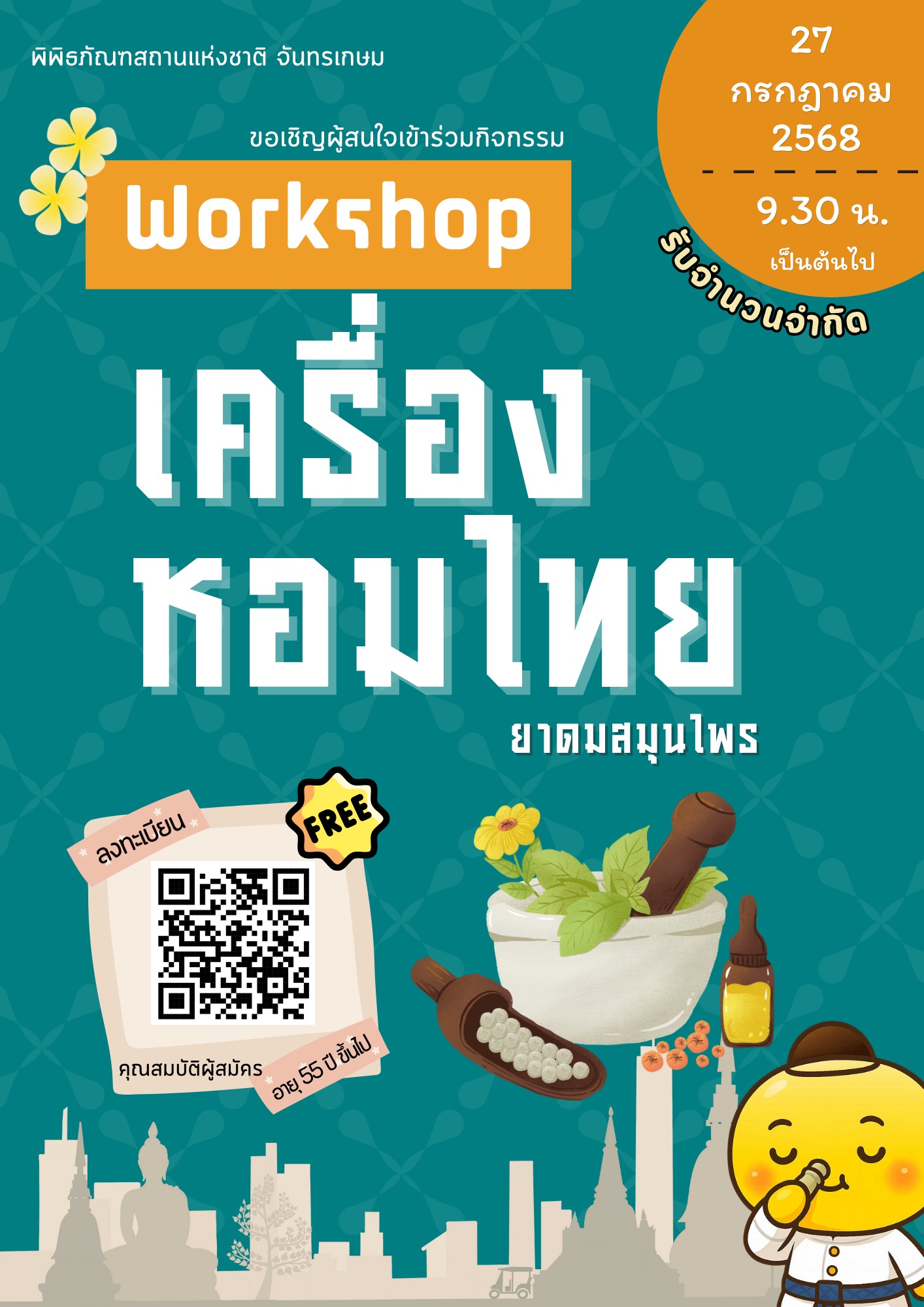 พิพิธภัณฑสถานแห่งชาติ จันทรเกษม ขอเชิญผู้สูงวัยมาร่วมเปิดประสบการณ์ใหม่กับกิจกรรมส่งเสริมสุขภาพและภูมิปัญญาไทย “ภูมิปัญญาหอมกรุ่น: ยาดมสมุนไพรไทยเสริมสุขภาพ สร้าง Soft Power ด้วยมือผู้สูงวัย” เรียนรู้สมุนไพรไทยในชีวิตประจำวัน และลงมือทำยาดมสมุนไพรอย่างง่าย เป็นการเสริมศักยภาพผู้สูงวัยให้เป็นพลังของชุมชน วันอาทิตย์ที่ 27 กรกฎาคม 2568 เวลา 9.30 น. เป็นต้นไป ณ พิพิธภัณฑสถานแห่งชาติ จันทรเกษม จังหวัดพระนครศรีอยุธยา คุณสมบัติผู้เข้าร่วมกิจกรรม ต้องเป็นผู้สูงวัยที่มีอายุ 55 ปีขึ้นไป รับจำนวนจำกัดเพียง 30 ท่านเท่านั้น ร่วมกิจกรรมได้ฟรี ไม่มีค่าใช้จ่าย ผู้สนใจสามารถสแกนลงทะเบียนเข้าร่วมกิจกรรมได้ทาง QR CODE หรือกดลิ้งค์นี้ https://forms.gle/corQENCZB6bKgYUK6 สอบถามเพิ่มเติม โทร. 0 3525 1586 หรือ Facebook พิพิธภัณฑสถานแห่งชาติ จันทรเกษม:Chantharakasem National Museum