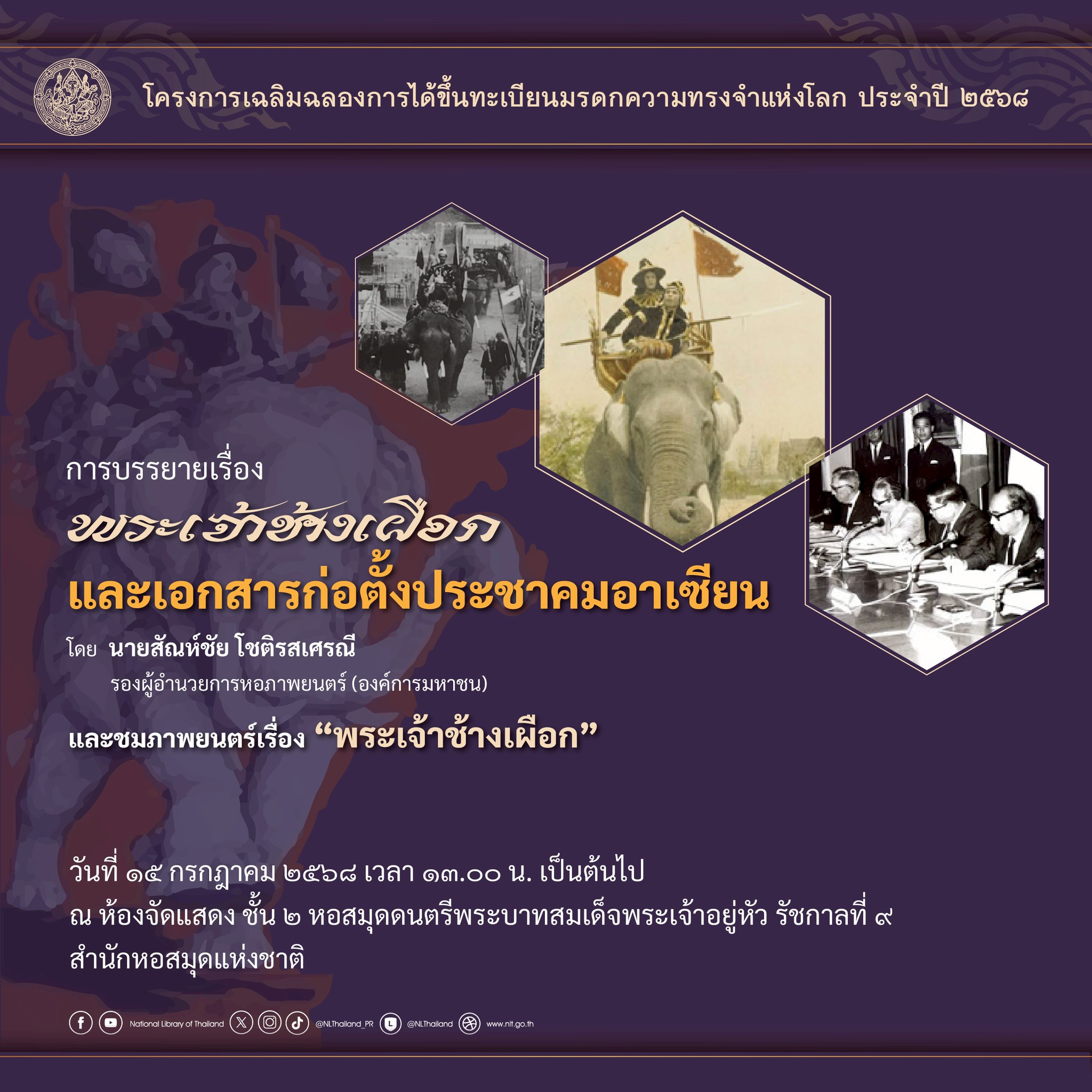 เวลา 13.00 - 16.30 น. เป็นการบรรยายเรื่อง “พระเจ้าช้างเผือกและเอกสารก่อตั้งประชาคมอาเซียน” โดย นายสัณห์ชัย โชติรสเศรณี รองผู้อำนวยการหอภาพยนตร์ (องค์การมหาชน) และนายธงชัย ลิขิตพรสวรรค์ นายกสมาคมจดหมายเหตุไทย จากนั้นเป็นการฉายภาพยนตร์เรื่อง “พระเจ้าช้างเผือก” ณ หอสมุดดนตรีพระบาทสมเด็จพระเจ้าอยู่หัว รัชกาลที่ 9 และห้องสมุดดนตรีทูลกระหม่อมสิรินธร นิทรรศการดังกล่าวจะเปิดให้เข้าชมระหว่างวันที่ 15 กรกฎาคม 2568 - วันที่ 29 สิงหาคม 2568 (วันจันทร์ - วันศุกร์ เวลา 9.00 น. - 16.00 น.)