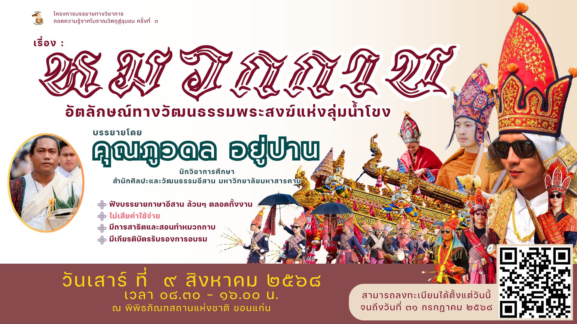 พิพิธภัณฑสถานแห่งชาติ ขอนแก่น ขอเชิญทุกท่านเข้าร่วมอบรมโครงการบรรยายทางวิชาการ “ถอดความรู้จากโบราณวัตถุสู่ชุมชน” ครั้งที่ ๓ เรื่อง “หมวกกาบ อัตลักษณ์ทางวัฒนธรรมพระสงฆ์แห่งลุ่มน้ำโขง” โดยวิทยากร คุณภูวดล อยู่ปาน นักวิชาการศึกษา สำนักศิลปะและวัฒนธรรมอีสาน มหาวิทยาลัยมหาสารคาม วันเสาร์ที่ ๙ สิงหาคม ๒๕๖๘ เวลา ๐๘.๓๐ - ๑๖.๐๐ น. ณ พิพิธภัณฑสถานแห่งชาติ ขอนแก่น พบกับการบรรยายภาษาอีสานตลอดงาน และกิจกรรมเวิร์กช็อปสอนทำหมวกกาบ ผู้เข้าร่วมอบรมจะได้รับเกียรติบัตรรับรอง ผู้สนใจสามารถร่วมกิจกรรมได้ฟรี ไม่มีค่าใช้จ่าย รับจำนวนจำกัดเพียง ๓๐ ท่านเท่านั้น! ลงทะเบียนได้โดยสแกนคิวอาร์โค้ดเพื่อสมัครลงทะเบียนได้เลย ทั้งนี้ การบรรยายครั้งนี้จะไม่มีการไลฟ์สดหากผู้สมัครท่านใดติดภารกิจมาไม่ได้ โปรดแจ้งยกเลิกล่วงหน้าด้วยนะคะเพื่อจะได้เปิดโอกาสให้ท่านอื่นเข้าร่วมกิจกรรมแทน สอบถามเพิ่มเติม โทร. ๐ ๔๓๒๔ ๖๑๗๐ หรือทางเฟซบุ๊ก : Khon Kaen National Museum พิพิธภัณฑสถานแห่งชาติ ขอนแก่น