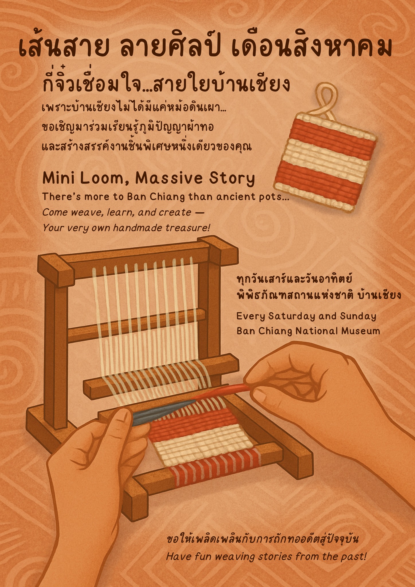 พิพิธภัณฑสถานแห่งชาติ บ้านเชียง จัดกิจกรรมเส้นสายลายศิลป์ ประจำเดือนสิงหาคม 2568 "กี่จิ๋วเชื่อมใจ....สายใยบ้านเชียง" เพราะบ้านเชียงไม่ได้มีแค่หม้อดินเผา ขอเชิญไปร่วมเรียนรู้ภูมิปัญญาผ้าทอและสร้างสรรค์งานขึ้นพิเศษหนึ่งเดียวของคุณ ผู้สนใจสามารถร่วมกิจกรรมได้ทุกวันเสาร์และวันอาทิตย์ ณ พิพิธภัณฑสถานแห่งชาติ บ้านเชียง จังหวัดอุดรธานี นักท่องเที่ยวที่เข้าร่วมกิจกรรมจะเพลิดเพลินกับการถักทออดีตรู้ปัจจุบันไปกับกิจกรรมสุดพิเศษในเดือนสิงหาคม 2568 สอบถามเพิ่มเติม โทร. 0 4223 5040 หรือทางเฟซบุ๊ก "พิพิธภัณฑสถานแห่งชาติ บ้านเชียง : Banchiang National Museum" https://www.facebook.com/bcnmfinearts