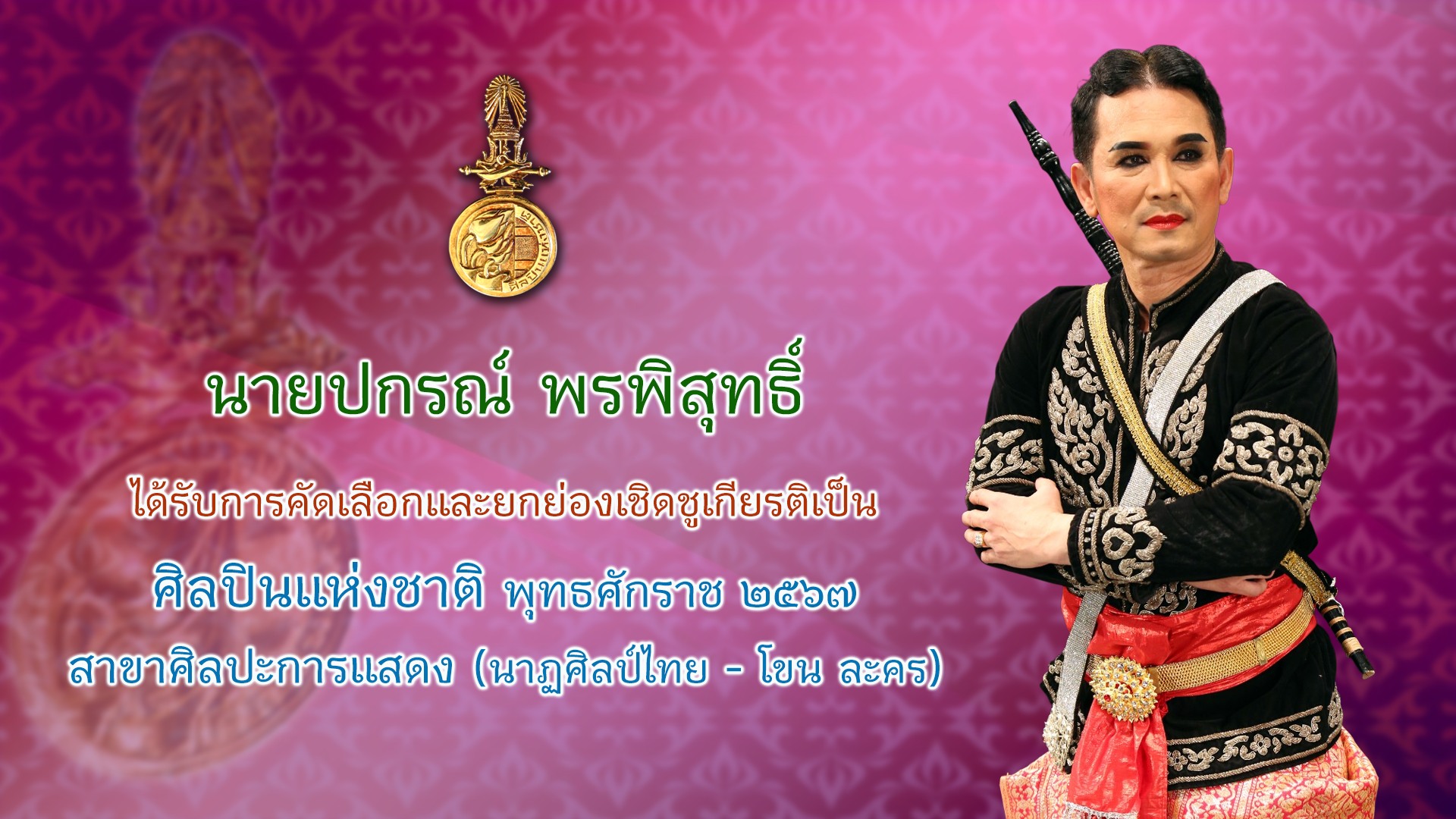 กรมศิลปากร ขอแสดงความยินดีกับนายปกรณ์ พรพิสุทธิ์ นาฏศิลปิน (ด้านอำนวยการแสดง) เนื่องในโอกาสได้รับการคัดเลือกและยกย่องเชิดชูเกียรติเป็นศิลปินแห่งชาติ พุทธศักราช ๒๕๖๗ สาขาศิลปะการแสดง (นาฏศิลป์ไทย - โขน ละคร)