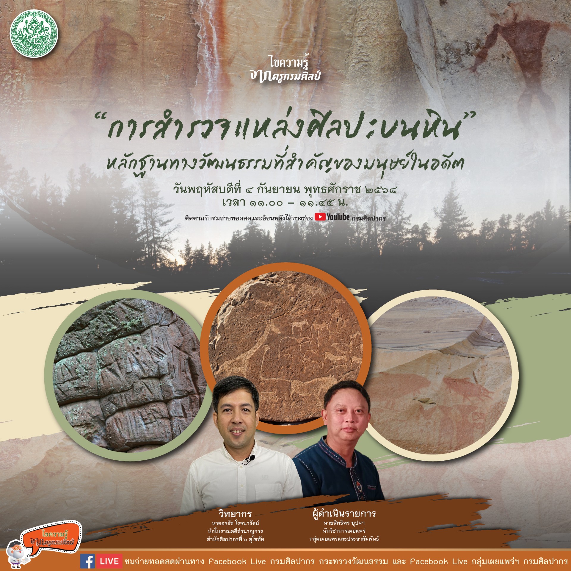 กรมศิลปากร ขอเชิญรับชมถ่ายทอด Facebook Live รายการไขความรู้จากครูกรมศิลป์ ตอน "การสำรวจแหล่งศิลปะบนหิน หลักฐานทางวัฒนธรรมที่สำคัญของมนุษย์ในอดีต" วิทยากร นายสรธัช โรจนารัตน์ นักโบราณคดีชำนาญการ สำนักศิลปากรที่ ๖ สุโขทัย ผู้ดำเนินรายการ นายสิทธิพร บุปผา นักวิชาการเผยแพร่ กลุ่มเผยแพร่และประชาสัมพันธ์ ในวันพฤหัสบดีที่ ๔ กันยายน พุทธศักราช ๒๕๖๘ เวลา ๑๑.๐๐ – ๑๑.๔๕ น. ผู้สนใจสามารถติดตามชมได้ทาง Facebook Live : กรมศิลปากร กระทรวงวัฒนธรรม และ Facebook Live : กลุ่มเผยแพร่ฯ กรมศิลปากร รายการ “ไขความรู้จากครูกรมศิลป์” มีรูปแบบเนื้อหาของรายการเกี่ยวกับประวัติความเป็นไทย เกร็ดประวัติศาสตร์ที่เกี่ยวข้องกับวันสำคัญ ประเพณี วัฒนธรรม วีถีชีวิตความเป็นอยู่ของผู้คน ผ่านการบอกเล่า ถ่ายทอดความรู้ แนวความคิด เนื้อหาวิชาการ จากประสบการณ์ของผู้บริหาร นักวิชาการ และผู้เชี่ยวชาญกรมศิลปากร กำหนดถ่ายทอดสดผ่านเฟสบุ๊กไลฟ์ (Facebook Live) ทุกวันพฤหัสบดี เวลา ๑๑.๐๐ น. ตลอดปีงบประมาณ ๒๕๖๘ ระหว่างเดือนตุลาคม ๒๕๖๗ - กันยายน ๒๕๖๘