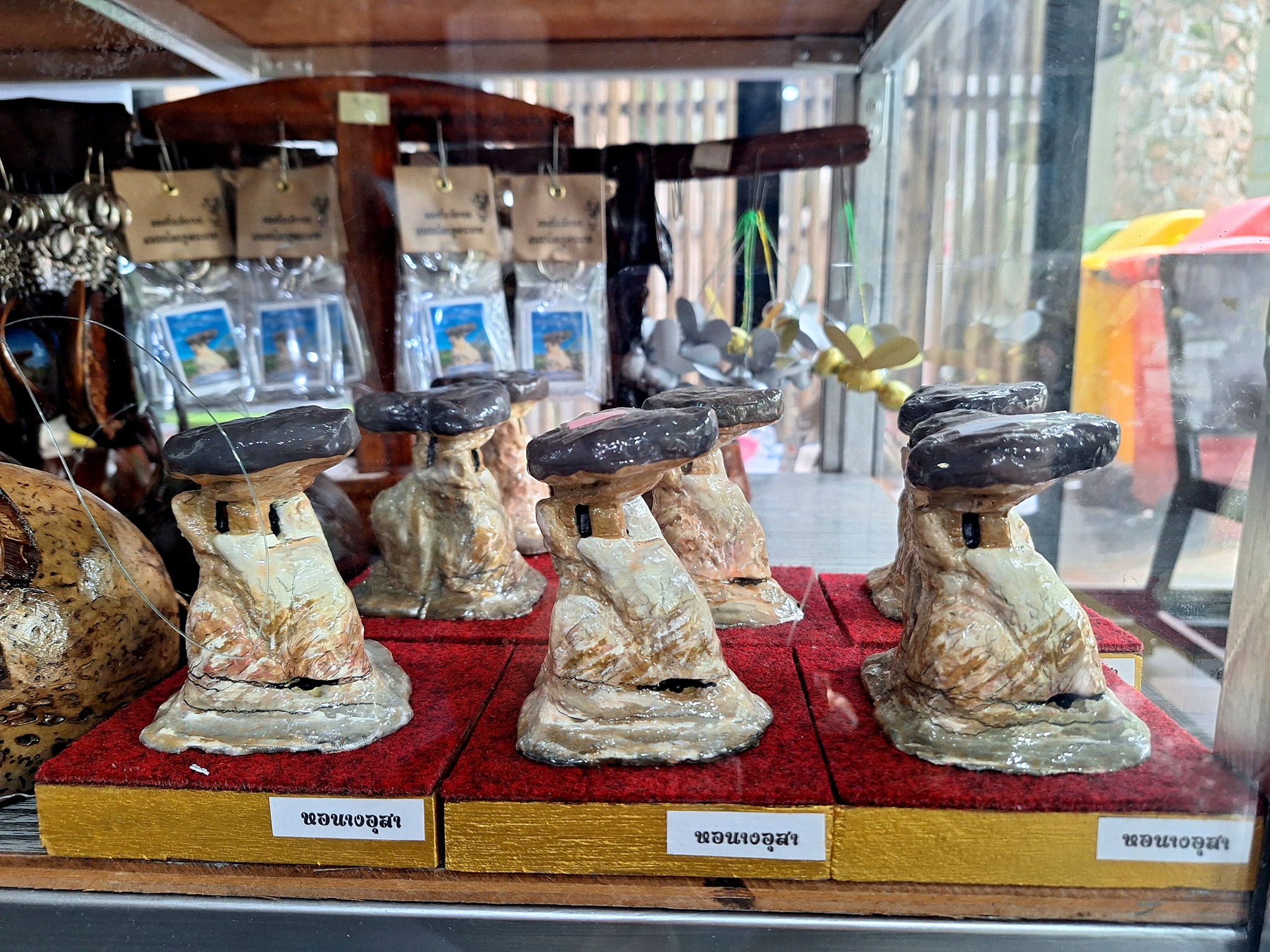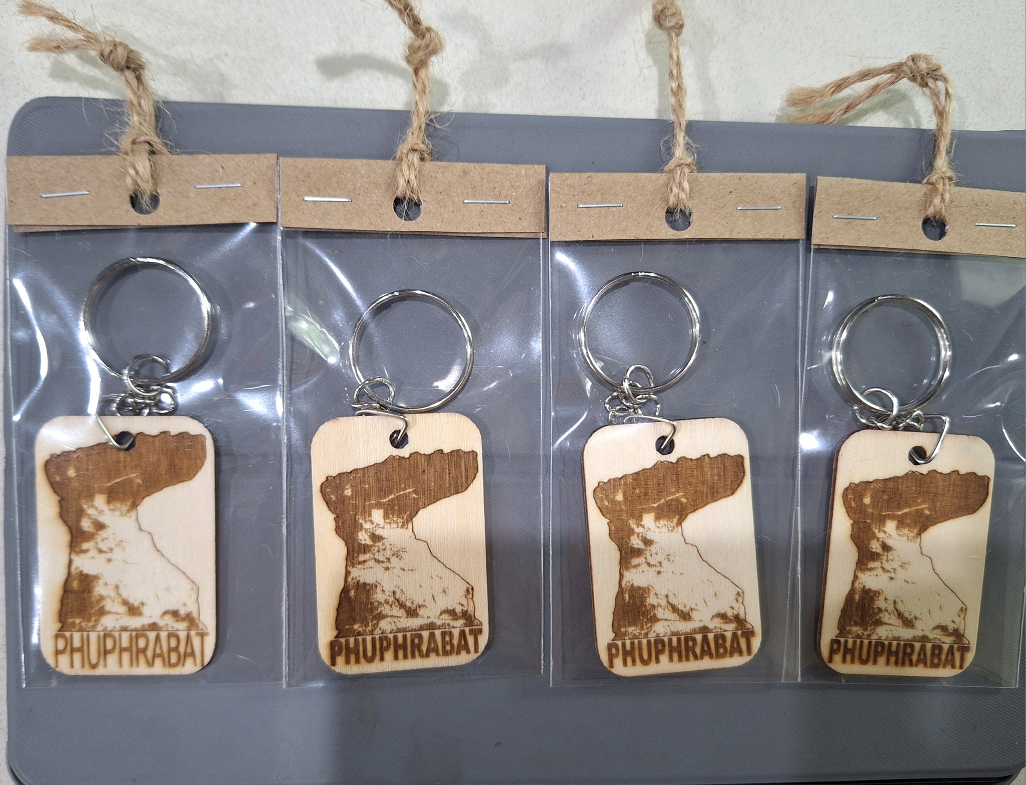 พวงกุญแจหอนางอุสา ทำจากไม้อัด มีทั้งแบบเป็นรูปภาพสวยงาม และแบบยิงเลเซอร์ ราคา 25 บาท
