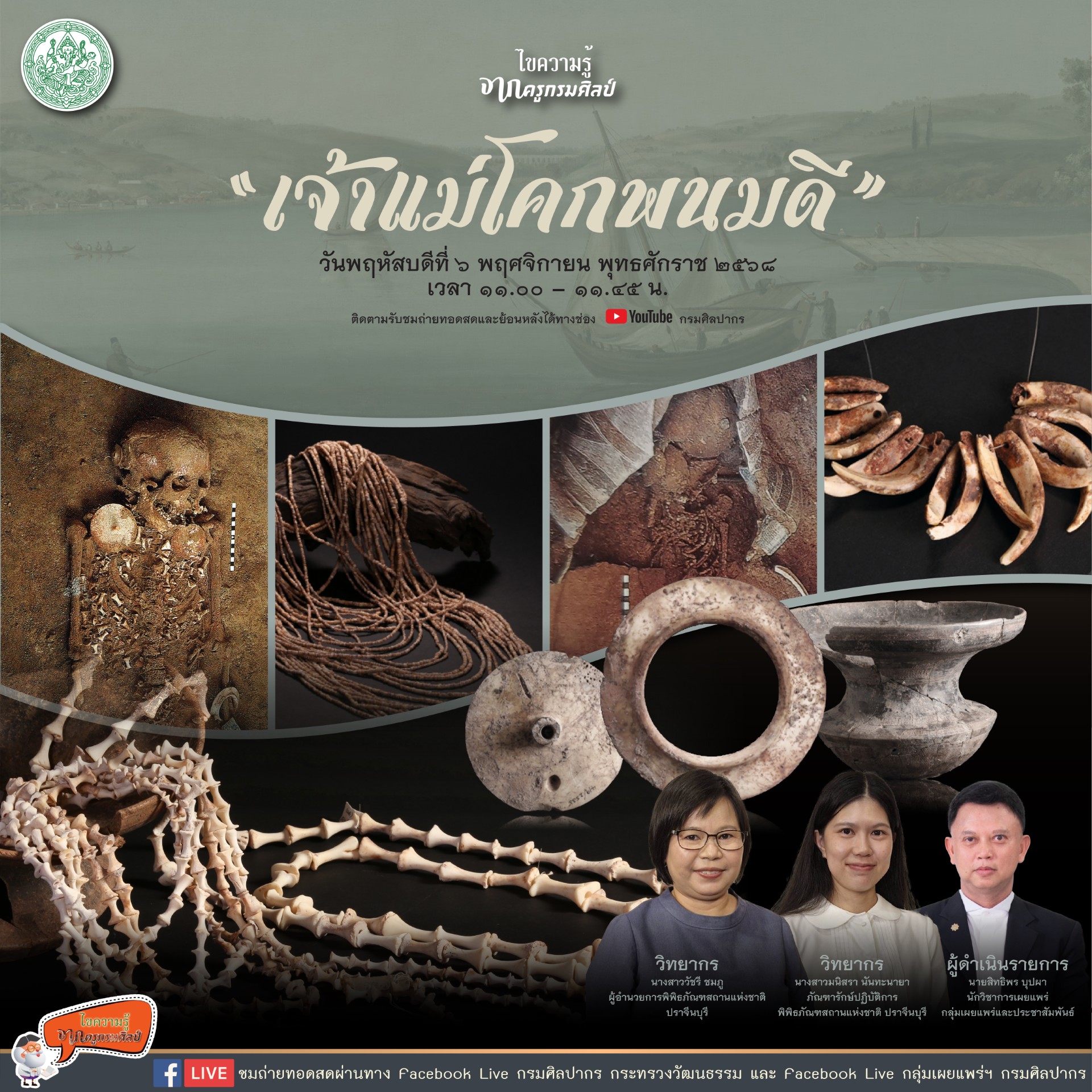 กรมศิลปากร ขอเชิญรับชมถ่ายทอด Facebook Live รายการไขความรู้จากครูกรมศิลป์ ตอน "ไขปริศนาเจ้าแม่โคกพนมดี" วิทยากร นางสาววัชรี ชมภู ผู้อำนวยการพิพิธภัณฑสถานแห่งชาติ ปราจีนบุรี และนางสาวมนิสรา นันทะนายา ภัณฑารักษ์ปฏิบัติการ พิพิธภัณฑสถานแห่งชาติ ปราจีนบุรี ผู้ดำเนินรายการ นายสิทธิพร บุปผา นักวิชาการเผยแพร่ กลุ่มเผยแพร่และประชาสัมพันธ์ ในวันพฤหัสบดีที่ ๖ พฤศจิกายน พุทธศักราช ๒๕๖๘ เวลา ๑๑.๐๐ – ๑๑.๔๕ น. ผู้สนใจสามารถติดตามชมได้ทาง Facebook Live : กรมศิลปากร กระทรวงวัฒนธรรม และ Facebook Live : กลุ่มเผยแพร่ฯ กรมศิลปากร รายการ “ไขความรู้จากครูกรมศิลป์” มีรูปแบบเนื้อหาของรายการเกี่ยวกับประวัติความเป็นไทย เกร็ดประวัติศาสตร์ที่เกี่ยวข้องกับวันสำคัญ ประเพณี วัฒนธรรม วีถีชีวิตความเป็นอยู่ของผู้คน ผ่านการบอกเล่า ถ่ายทอดความรู้ แนวความคิด เนื้อหาวิชาการ จากประสบการณ์ของผู้บริหาร นักวิชาการ และผู้เชี่ยวชาญกรมศิลปากร กำหนดถ่ายทอดสดผ่านเฟสบุ๊กไลฟ์ (Facebook Live) ทุกวันพฤหัสบดี เวลา ๑๑.๐๐ น. ตลอดปีงบประมาณ ๒๕๖๙ ระหว่างเดือนตุลาคม ๒๕๖๘ - กันยายน ๒๕๖๙
