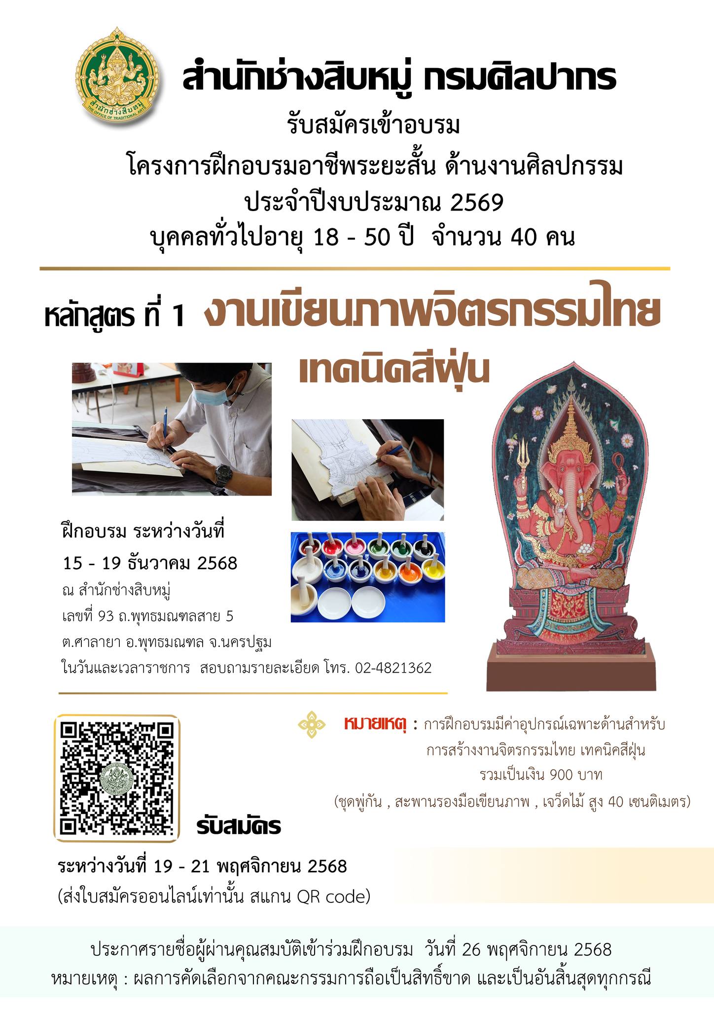 กรมศิลปากร สำนักช่างสิบหมู่ โดยศูนย์ศิลปะและการช่างไทย เปิดรับสมัครผู้สนใจเข้าร่วมอบรมโครงการฝึกอาชีพระยะสั้น ด้านงานศิลปกรรม ประจำปีงบประมาณ พ.ศ. 2569 จำนวน 2 หลักสูตร ได้แก่ หลักสูตรงานเขียนภาพจิตรกรรมไทย เทคนิคสีฝุ่น และหลักสูตรงานแกะสลักโฟม ระยะเวลาการรับสมัคร วันที่ 19 - 21 พฤศจิกายน 2568 กำหนดจัดอบรม ณ สำนักช่างสิบหมู่ กรมศิลปากร ผู้สนใจสามารถเลือกสมัครเข้ารับการอบรมได้เพียงท่านละ 1 หลักสูตรเท่านั้น รับผู้สมัครที่มีอายุ 18 - 50 ปี หลักสูตรละ 40 คน โดยรับสมัครผ่านทางระบบออนไลน์