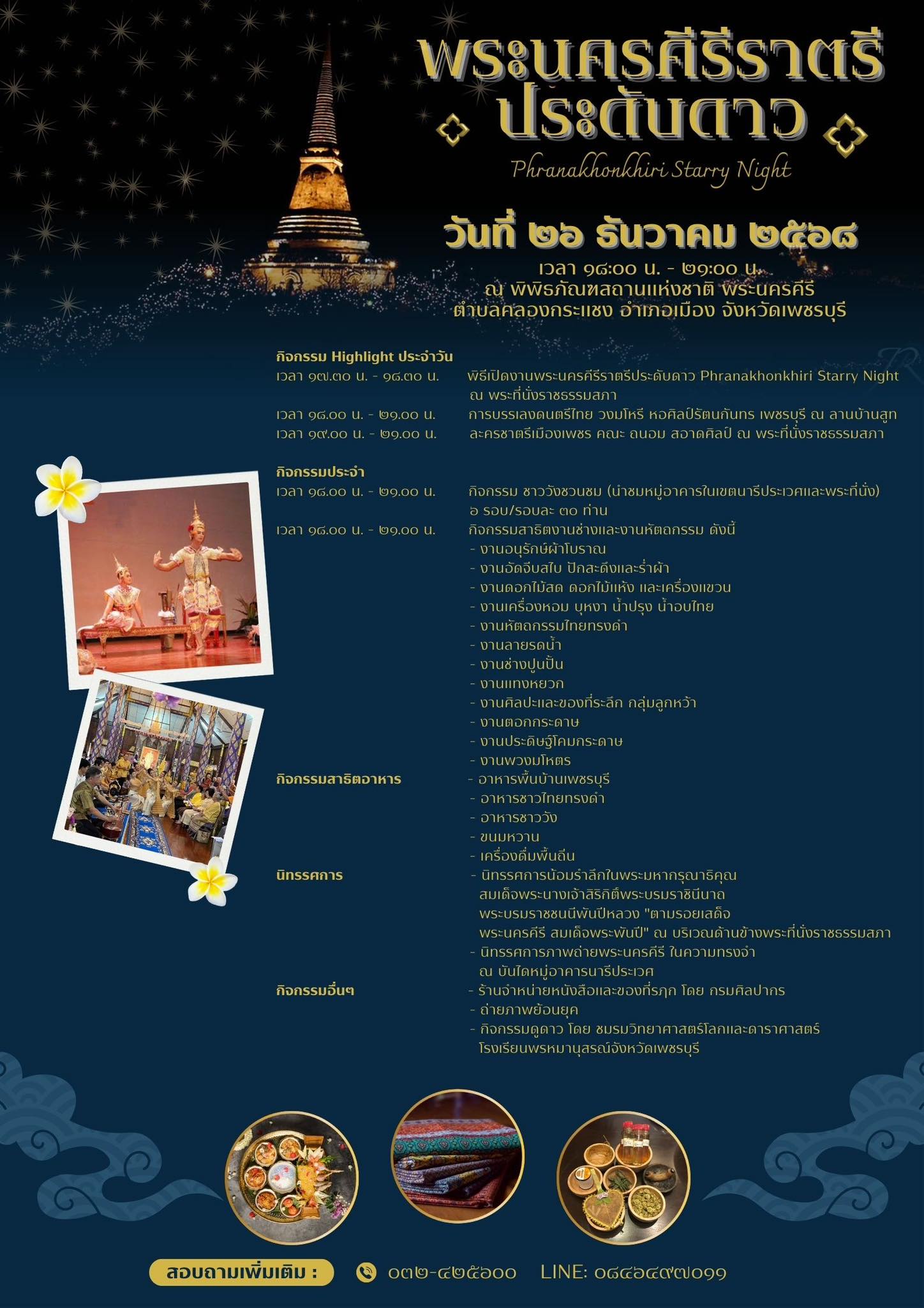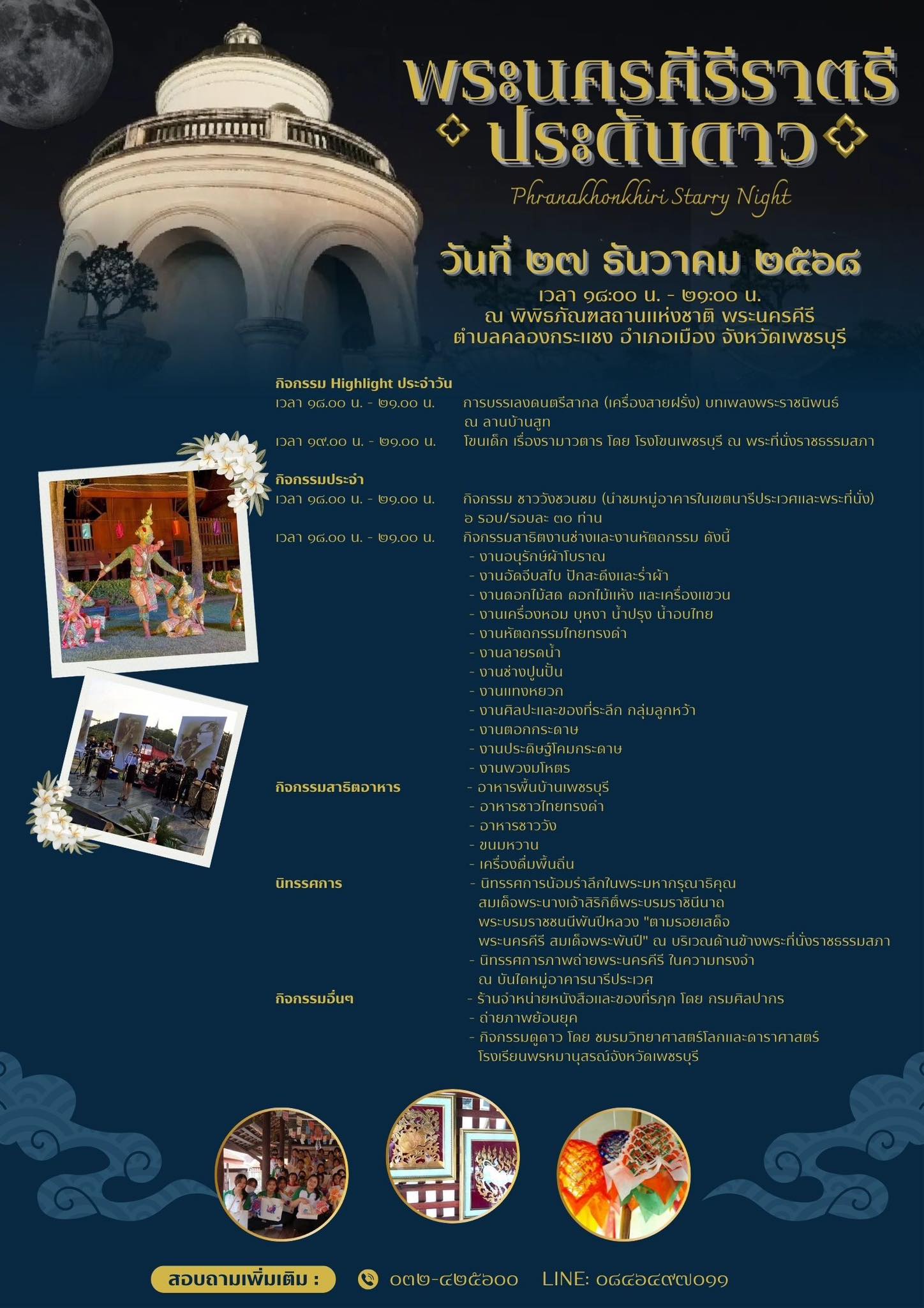 พิพิธภัณฑสถานแห่งชาติ พระนครคีรี จังหวัดเพชรบุรี ขอเชิญชวนทุกท่านเข้าร่วมงาน "พระนครคีรีราตรีประดับดาว (Phranakhonkhiri Starry Night)" ระหว่างวันที่ 26 - 28 ธันวาคม 2568 ในเวลา 18.00 น. - 21.00 น. ครั้งแรกของการเปิดเขตนารีประเวศ (เขตพระราชฐานชั้นใน หรือที่เรียกกันว่า "ฝ่ายใน") ให้ทุกท่านได้เข้าชม พร้อมร่วมกิจกรรมมากมาย ดังนี้ - พิพิธภัณฑ์ยามราตรี (Night Museum) ครั้งแรกของพระนครคีรี