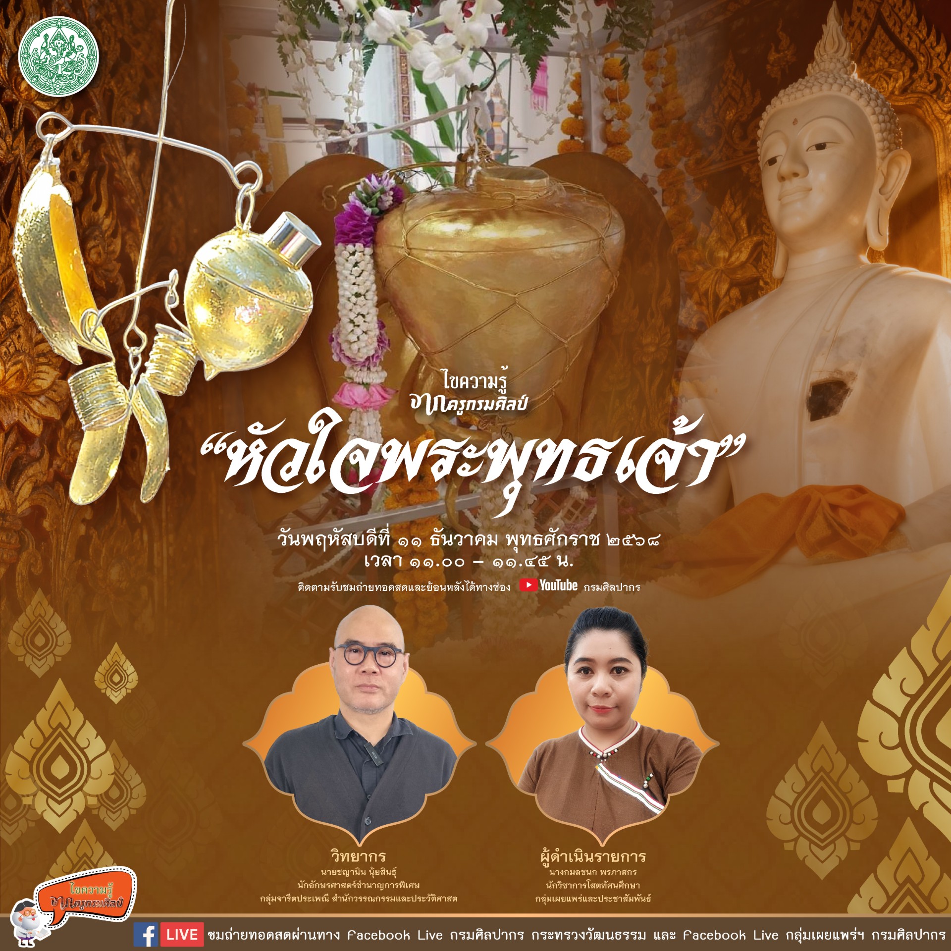 กรมศิลปากร ขอเชิญชวนทุกท่านร่วมทำความรู้จัก "หัวใจพระพุทธเจ้า" ตามความเชื่อและศรัทธาของพุทธศาสนิกชน ว่ามีความเป็นมารวมไปถึงคติธรรมอย่างไรบ้าง กับ ชญานิน นุ้ยสินธุ์ นักอักษรศาสตร์ชำนาญการพิเศษ กลุ่มจารีตประเพณี สำนักวรรณกรรมและประวัติศาสตร์ ผ่านรายการ ไขความรู้จากครูกรมศิลป์ ในวันพฤหัสบดีที่ ๑๑ ธันวาคม พุทธศักราช ๒๕๖๘ เวลา ๑๑.๐๐ – ๑๑.๔๕ น. ในช่องทาง Facebook : กรมศิลปากร กระทรวงวัฒนธรรม และ Facebook : กลุ่มเผยแพร่ฯ กรมศิลปากร รายการ “ไขความรู้จากครูกรมศิลป์” มีรูปแบบเนื้อหาของรายการเกี่ยวกับประวัติความเป็นไทย เกร็ดประวัติศาสตร์ที่เกี่ยวข้องกับวันสำคัญ ประเพณี วัฒนธรรม วีถีชีวิตความเป็นอยู่ของผู้คน ผ่านการบอกเล่า ถ่ายทอดความรู้ แนวความคิด เนื้อหาวิชาการ จากประสบการณ์ของผู้บริหาร นักวิชาการ และผู้เชี่ยวชาญกรมศิลปากร กำหนดถ่ายทอดสดผ่านเฟสบุ๊กไลฟ์ (Facebook Live) ทุกวันพฤหัสบดี เวลา ๑๑.๐๐ น. ตลอดปีงบประมาณ ๒๕๖๙ ระหว่างเดือนตุลาคม ๒๕๖๘ - กันยายน ๒๕๖๙