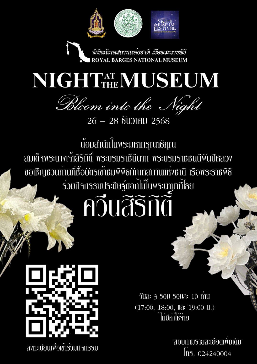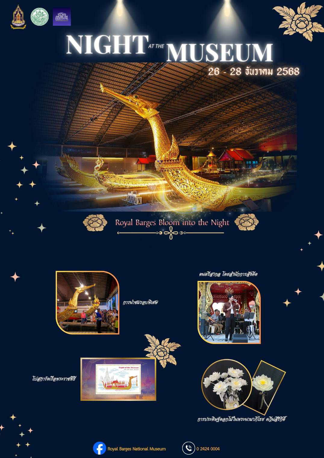พิพิธภัณฑสถานแห่งชาติ เรือพระราชพิธี เปิดให้ชมความวิจิตรงดงามของเรือพระราชพิธียามค่ำคืน มรดกวัฒนธรรมอันทรงคุณค่าแห่งสายน้ำ ระหว่างวันที่ 26 - 28 ธันวาคม 2568 เวลา 09.00 น. - 20.30 น. ปีนี้จัดภายใต้แนวคิด Bloom into the Night การเบ่งบานทางวัฒนธรรม มีไฮไลท์ช่วงค่ำที่ไม่ควรพลาด ดังต่อไปนี้
