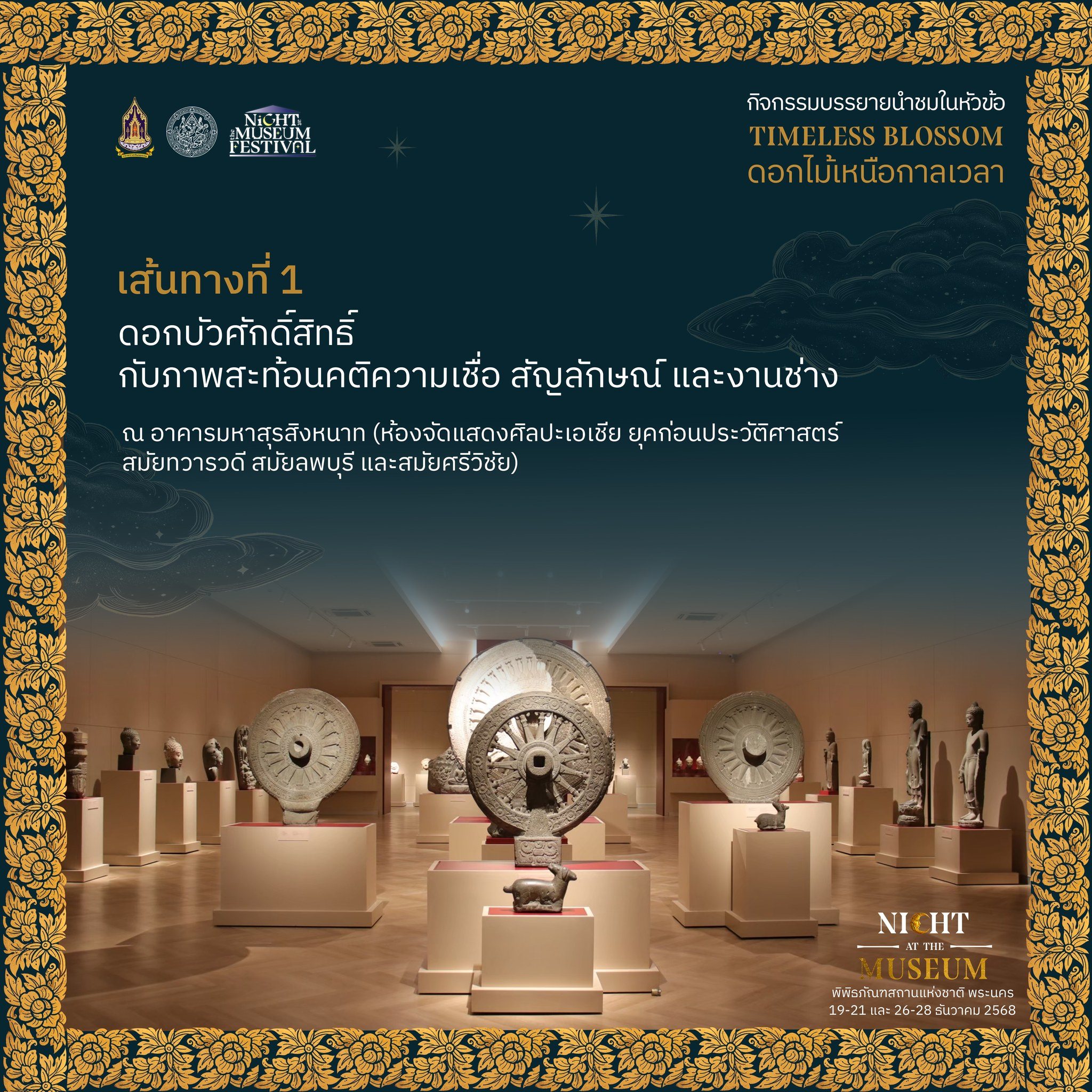 - เส้นทางที่ 1 “ดอกบัวศักดิ์สิทธิ์ กับภาพสะท้อนคติความเชื่อ สัญลักษณ์ และงานช่าง” ณ อาคารมหาสุรสิงหนาท (ห้องจัดแสดง ศิลปะเอเชีย, ยุคก่อนประวัติศาสตร์, สมัยทวารวดี, สมัยลพบุรี, และสมัยศรีวิชัย)