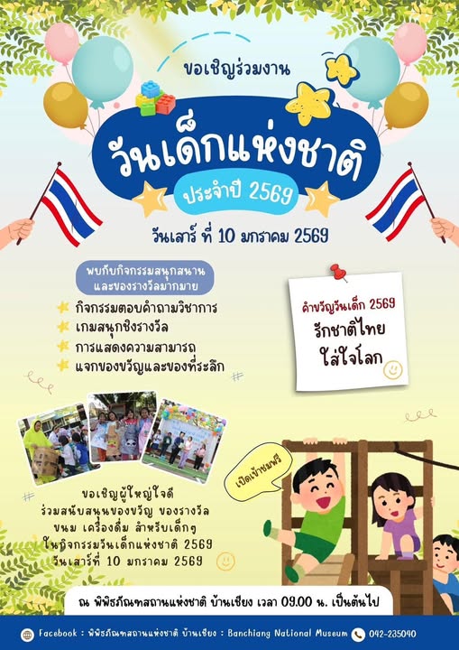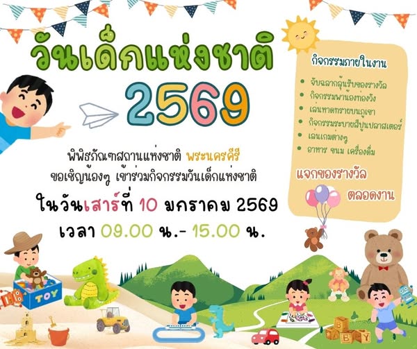 ขอเชิญชวนผู้ปกครอง เด็ก ๆ และเยาวชน ร่วมกิจกรรมเนื่องในวันเด็กแห่งชาติ ประจำปี 2569 ณ หน่วยงานในสังกัดกรมศิลปากรใกล้บ้าน ติดตามรายละเอียดเพิ่มเติมได้ทางเว็บไซต์ กรมศิลปากร www.finearts.go.th