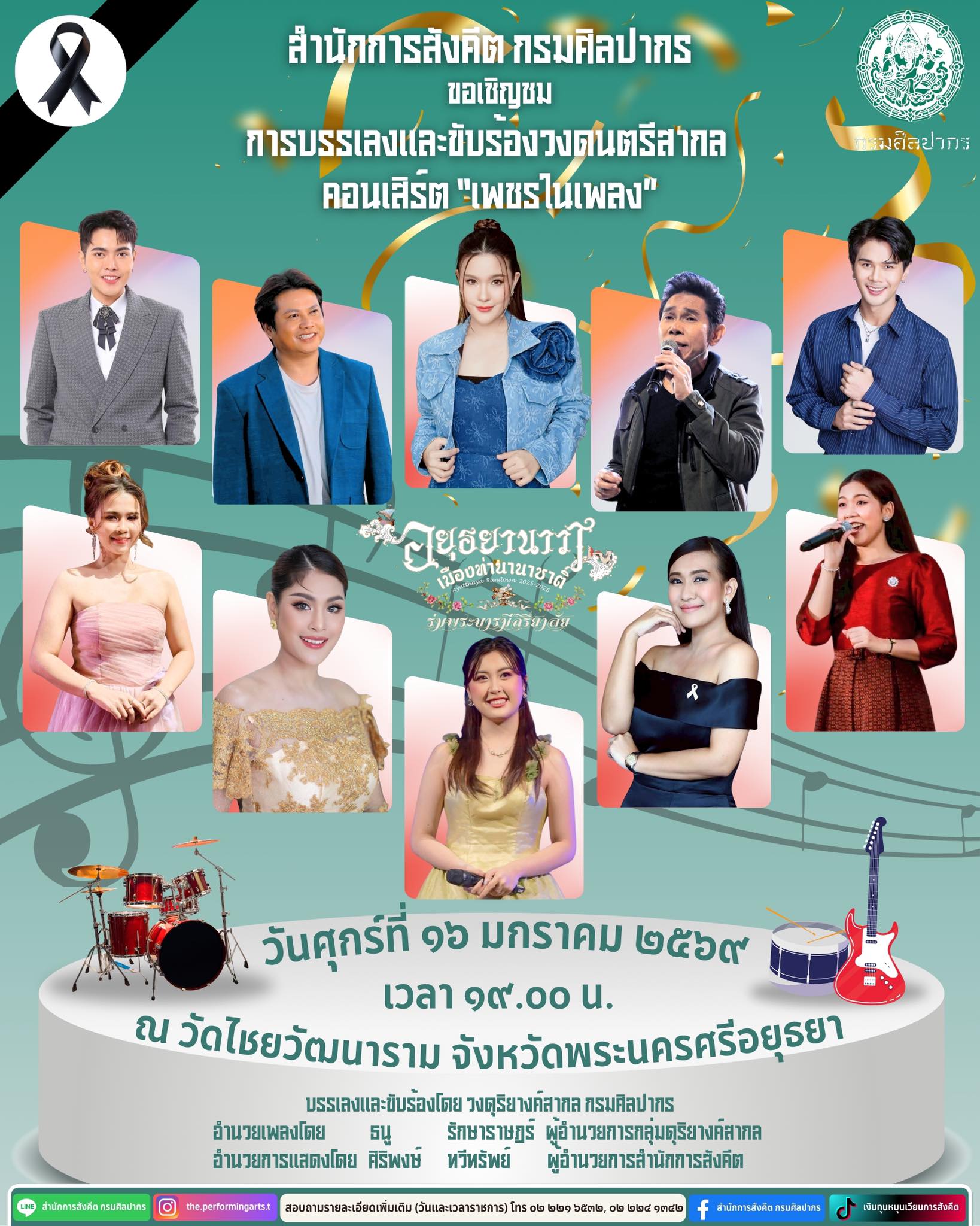 อุทยานประวัติศาสตร์พระนครศรีอยุธยา ขอเชิญรับชมการแสดงศิลปวัฒนธรรม ในงาน "อยุธยานาวา เมืองท่านานาชาติ ร่มพระบารมีสิริยาลัย" ณ เวทีใหญ่ วัดไชยวัฒนาราม จังหวัดพระนครศรีอยุธยา ประจำสัปดาห์นี้ โดยในวันศุกร์ ที่ 16 มกราคม 2569 พบกับการบรรเลงและขับร้องวงดนตรีสากล โดยสำนักการสังคีต กรมศิลปากร และศิลปินเพชรในเพลง เวลา 19.00 น. เป็นต้นไป, วันเสาร์ ที่ 17 มกราคม 2569 การแสดง "เพลงลำตัด" โดยคณะแม่ศรีนวล ขำอาจ ศิลปินแห่งชาติ เวลา 18.00 น. เป็นต้นไป, วันอาทิตย์ที่ 18 มกราคม 2569 "การแสดงโปงลาง" โดยวิทยาลัยนาฏศิลป ร้อยเอ็ด เวลา 18.00 น. เป็นต้นไป นอกจากนี้นักท่องเที่ยวยังสามารถชื่นชมบรรยากาศโบราณสถานอันสวยงามยามค่ำคืน ณ วัดไชยวัฒนาราม และวัดพระราม เวลา 18.30 - 21.30 น. วันศุกร์ เสาร์ อาทิตย์ได้อีกด้วย