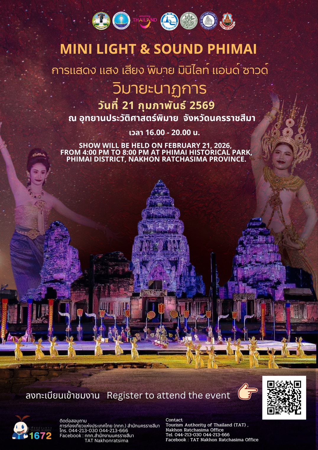 กรมศิลปากร ขอเชิญชวนนักท่องเที่ยว ร่วมสัมผัสความยิ่งใหญ่ของอารยธรรมขอมโบราณในงาน "Mini Light & Sound Phimai: วิมายะนาฏการ" ชมการแสดงแสง สี เสียง อันวิจิตรบรรจง ณ อุทยานประวัติศาสตร์พิมาย ที่จะพาคุณย้อนเวลากลับไปสัมผัสตำนานอันทรงคุณค่า ในบรรยากาศที่อบอุ่นและเป็นกันเอง ในวันที่ 24 มกราคม 2569 เวลา 16.00 - 20.00 น. ณ อุทยานประวัติศาสตร์พิมาย อำเภอพิมาย จังหวัดนครราชสีมา จัดโดยการท่องเที่ยวแห่งประเทศไทย สำนักงานนครราชสีมา ผู้ที่สนใจสามารถลงทะเบียนผ่าน QR Code ในโปสเตอร์ หรือกดลิงก์ เพื่อแจ้งรายชื่อการเข้าชมการแสดงฯ https://eform.tourismthailand.org/public/tatkorat-15 สอบถามเพิ่มเติม โทร. 0 4421 3030, 0 4421 3666 Facebook : ททท.สำนักงานนครราชสีมา TAT Nakhonratchasima https://www.facebook.com/TATNakhonratchasima