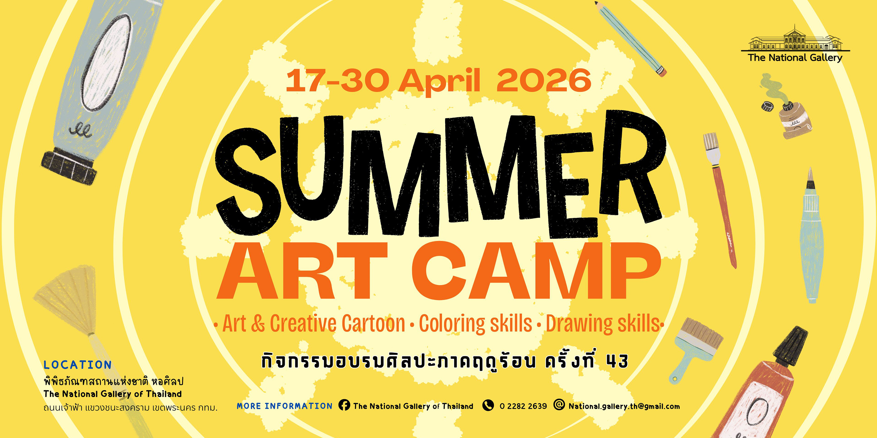 พิพิธภัณฑสถานแห่งชาติ หอศิลป เปิดรับสมัครเด็ก เยาวชน และผู้สนใจร่วมกิจกรรม "Summer Art Camp" อบรมศิลปะภาคฤดูร้อน ณ พิพิธภัณฑสถานแห่งชาติ หอศิลป (หอศิลป์เจ้าฟ้า) ถนนเจ้าฟ้า เขตพระนคร กรุงเทพมหานคร รับสมัครระหว่างวันที่ 18 กุมภาพันธ์ - 29 มีนาคม 2569 ณ อาคารสำนักงาน ชั้น 2 เปิดทำการวันพุธ - อาทิตย์ เวลา 09.30 - 15.30 น. หยุดวันจันทร์ - อังคาร กำหนดจัดอบรมระหว่างวันที่ 17 - 30 เมษายน 2569