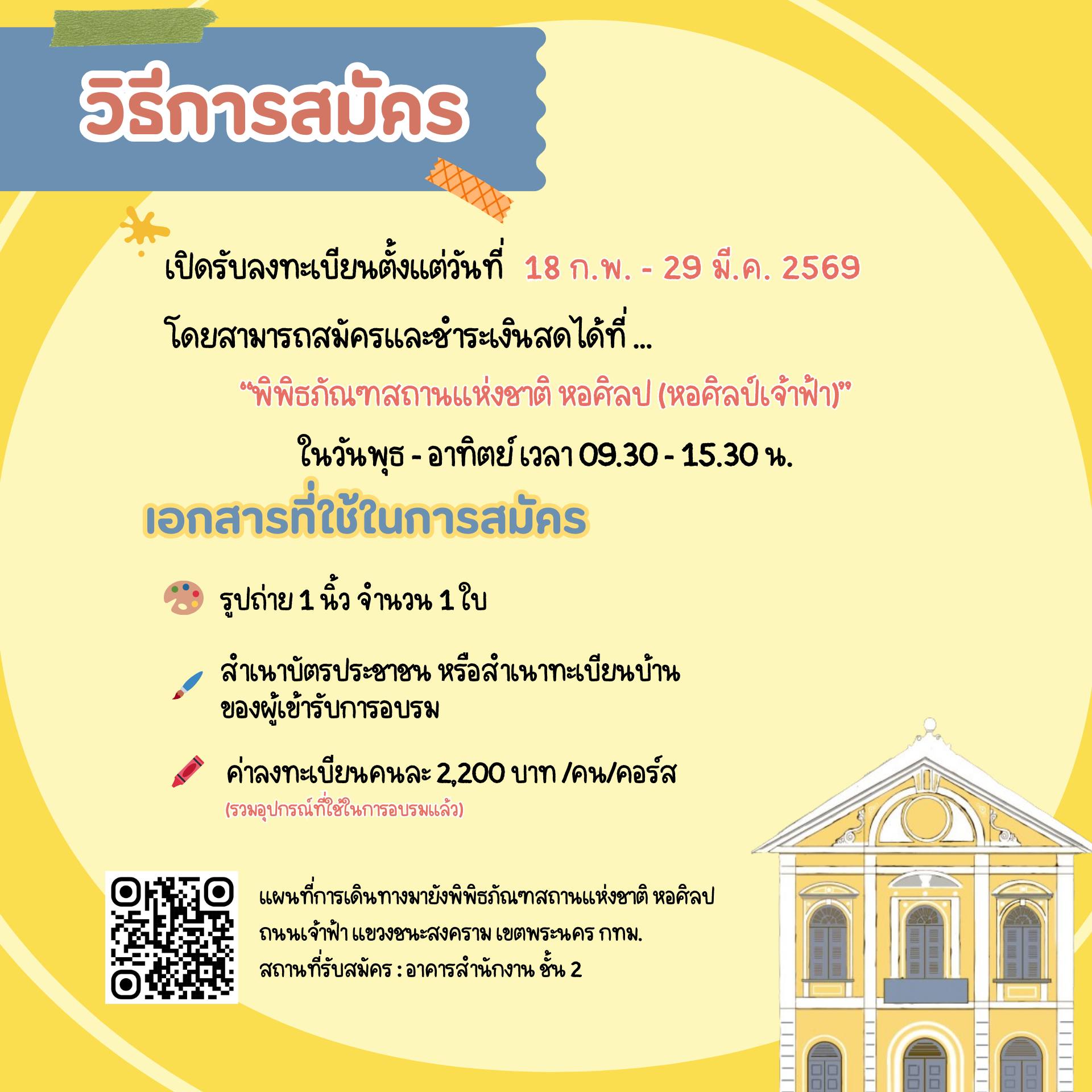 เอกสารที่ใช้ในการสมัคร 1. รูปถ่าย 1 นิ้ว จำนวน 1 ใบ 2. สำเนาบัตรประชาชน หรือสำเนาทะเบียนบ้านของผู้เข้ารับการอบรม 3. ค่าลงทะเบียนคนละ 2,200 บาท /คน/คอร์ส (รับเฉพาะเงินสด) ผู้สนใจสามารถสมัครด้วยตนเองและชำระเงินที่พิพิธภัณฑสถานแห่งชาติ หอศิลปเท่านั้น ในกรณีคลาสเรียนสำหรับเด็ก ผู้ปกครองสามารถมาสมัครแทนได้ (*ไม่รับโอนเงิน / ไม่รับสมัครออนไลน์ทุกกรณี กรุณาตรวจสอบตารางเรียนก่อนสมัคร หากยืนยันแล้วไม่สามารถเปลี่ยนคอร์ส และขอสงวนสิทธิ์คืนเงินทุกกรณี)