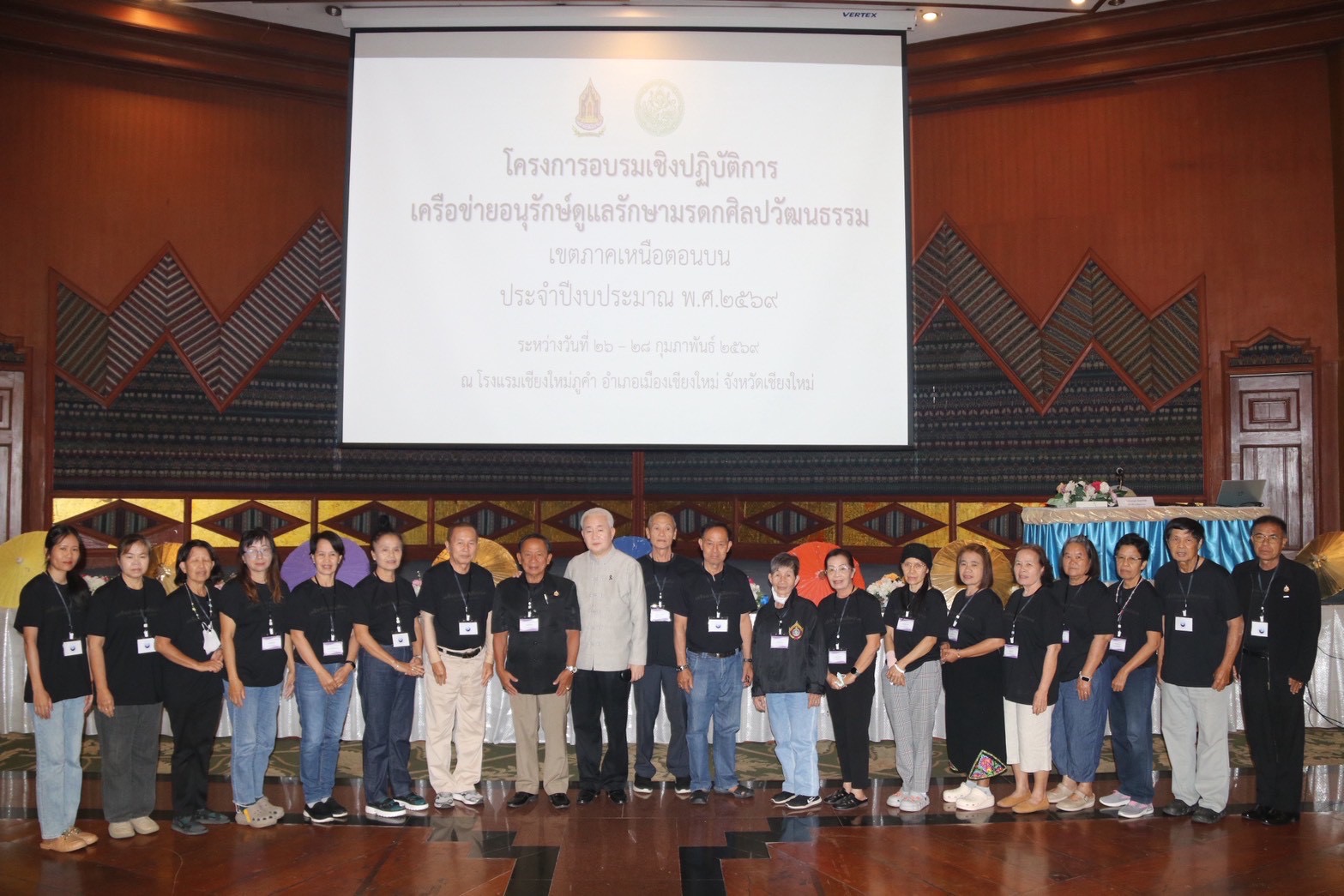 การอบรมเชิงปฏิบัติการเครือข่ายอนุรักษ์ดูแลรักษามรดกทางศิลปวัฒนธรรม เขตภาคเหนือตอนบน ประจำปีงบประมาณ พ.ศ. 2569 จัดขึ้นระหว่างวันที่ 26 – 28 กุมภาพันธ์ 2569 ณ จังหวัดเชียงใหม่ โดยมีการบรรยายเสริมสร้างความรู้ ความเข้าใจในบทบาทหน้าที่ของเครือข่ายอนุรักษ์ ความรู้เกี่ยวกับแนวทางและมาตรฐานในการดูแลรักษามรดกทางศิลปวัฒนธรรมด้านโบราณสถาน ศิลปกรรมในเขตโบราณสถาน และโบราณวัตถุ ศิลปวัตถุ ตลอดจนมรดกทางศิลปวัฒนธรรมอื่นๆ ส่งเสริมให้เล็งเห็นคุณค่าและความสำคัญของมรดกทางศิลปวัฒนธรรมที่มีต่อชาติและท้องถิ่น รวมถึงความรู้ด้านกฎหมาย กฎ ระเบียบที่เกี่ยวข้อง ภายใต้หน้าที่และความรับผิดชอบของกรมศิลปากร โดยวิทยากรผู้ทรงคุณวุฒิ นอกจากนี้ยังนำผู้เข้าร่วมอบรมศึกษาดูงานการบูรณะโบราณสถานในพื้นที่จังหวัดเชียงใหม่อีกด้วย