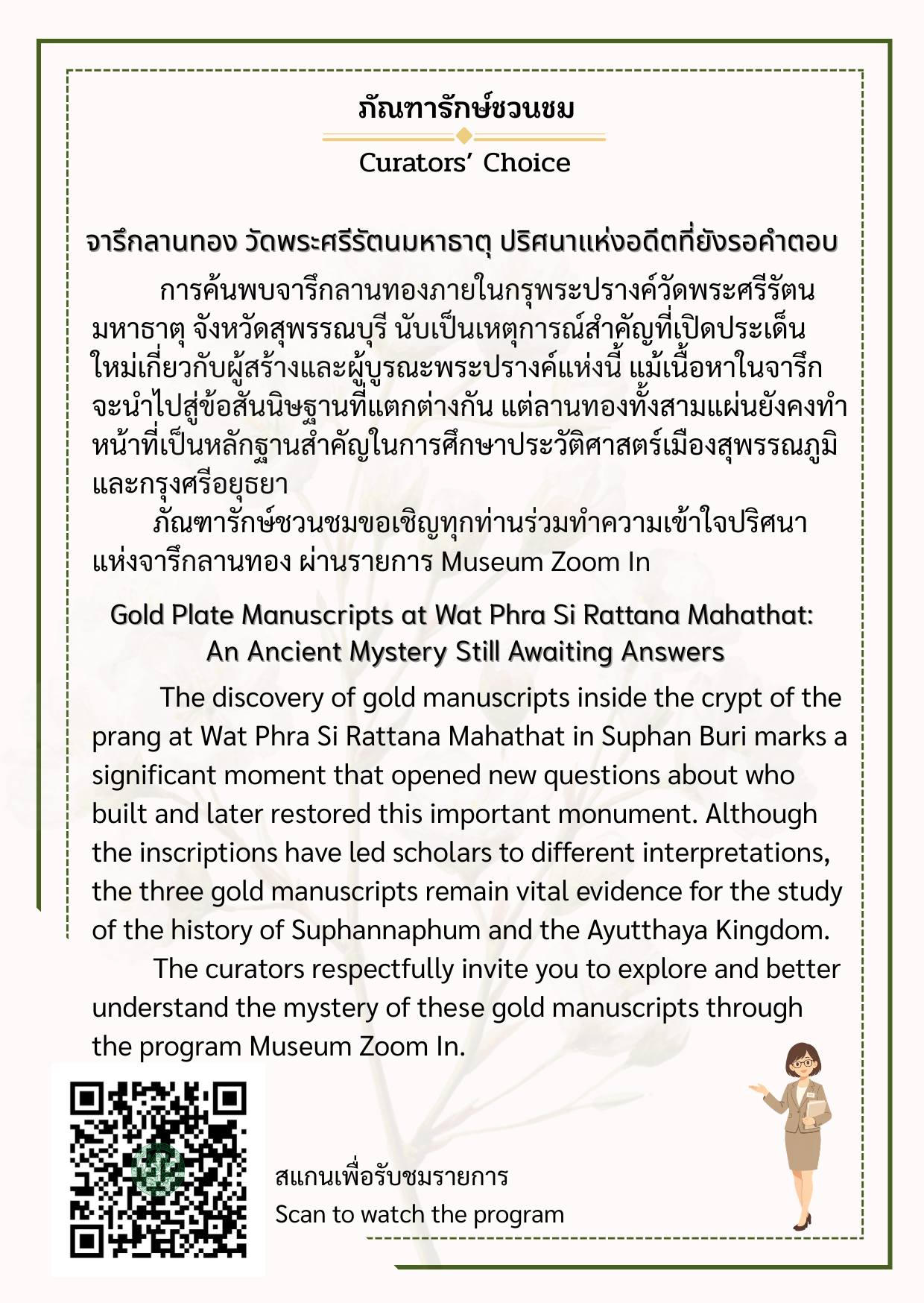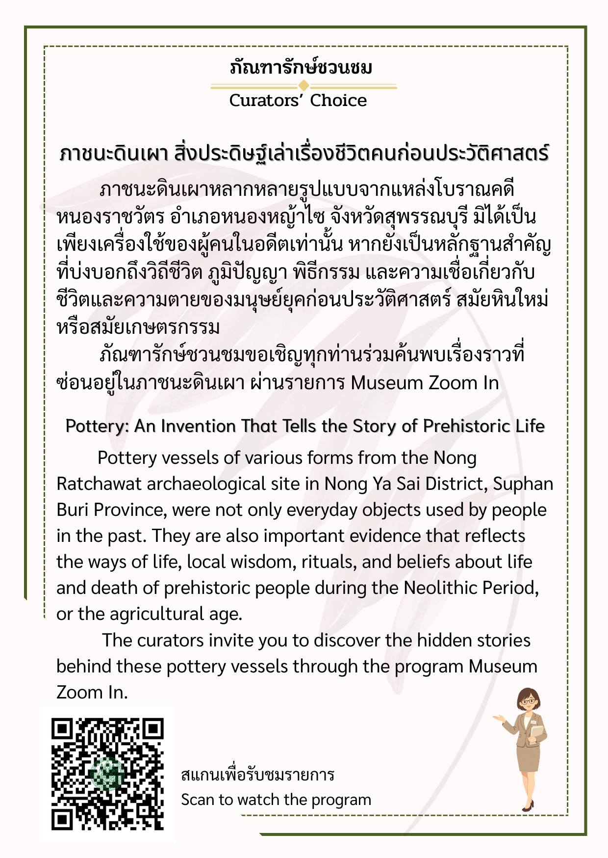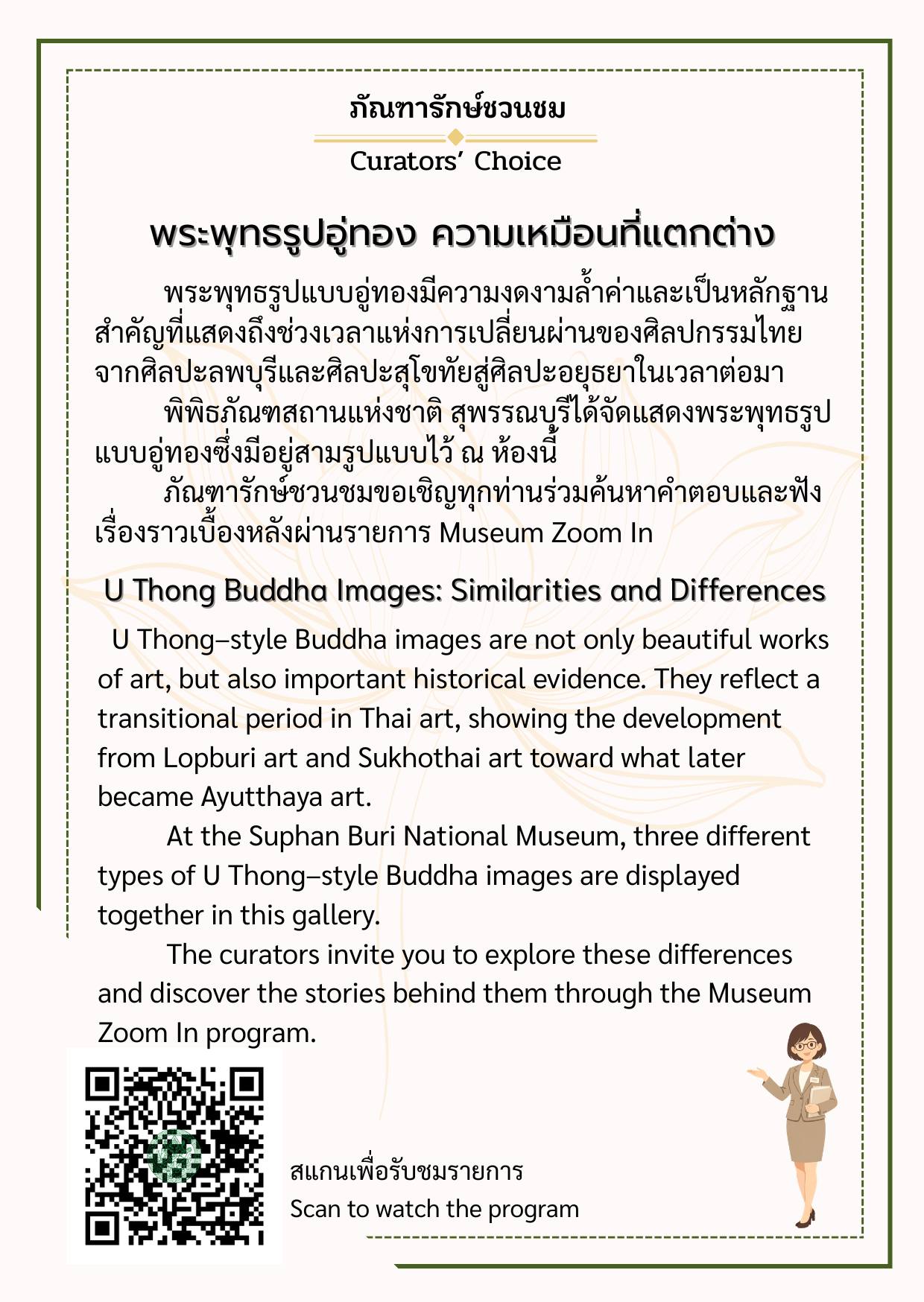 พิพิธภัณฑสถานแห่งชาติ สุพรรณบุรี ขอเชิญชวนทุกท่านมาทำความรู้จักกับโบราณวัตถุและเรื่องราวสำคัญที่ภัณฑารักษ์คัดเลือกมาเป็นพิเศษ ผ่านกิจกรรม “ภัณฑารักษ์ชวนชม (Curators’ Choice)” ผู้ชมสามารถสแกน QR Code เพื่อรับฟังคำอธิบายเพิ่มเติมผ่านรายการ Museum Zoom In แล้วคุณอาจค้นพบว่า วัตถุชิ้นเดิมที่เคยเดินผ่านนั้น มีเรื่องราวมากกว่าที่คิด มาร่วมค้นพบเรื่องเล่าจากวัตถุไปพร้อมกัน ณ พิพิธภัณฑสถานแห่งชาติ สุพรรณบุรี สอบถามเพิ่มเติม โทร. 0 3553 6100 Facebook พิพิธภัณฑสถานแห่งชาติ สุพรรณบุรี Suphanburi National Museum