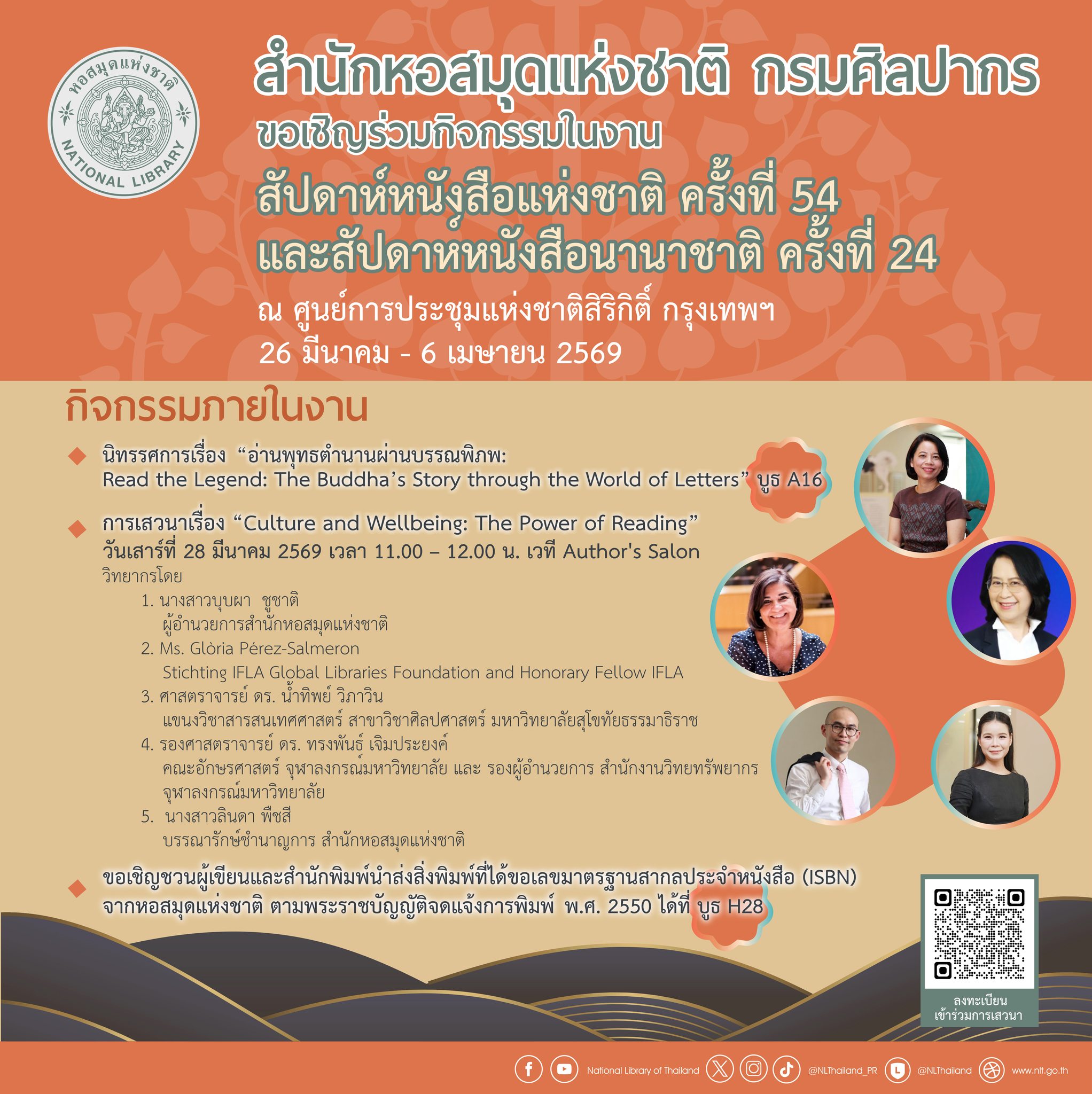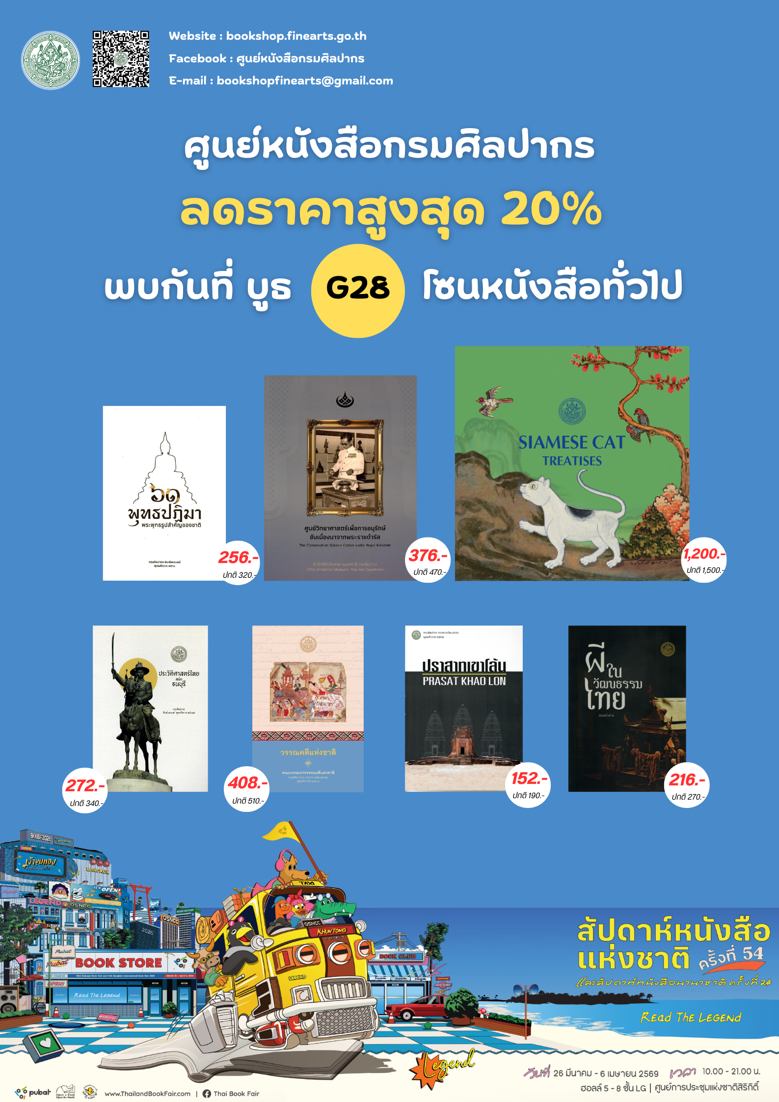 กรมศิลปากร โดยศูนย์หนังสือกรมศิลปากร ยกกองทัพหนังสือเก่า หนังสือออกใหม่ ลดราคาสูงสุดถึง 20% ในงานสัปดาห์หนังสือแห่งชาติ ครั้งที่ 54 และสัปดาห์หนังสือนานาชาติ ครั้งที่ 24 ที่บูธ G 28 โซนหนังสือทั่วไป ตั้งแต่วันที่ 26 มีนาคม - 6 เมษายน 2569 เวลา 10.00 – 21.00 น. ณ ฮอลล์ 5 - 8 ชั้น LG ศูนย์การประชุมแห่งชาติสิริกิติ์ นายพนมบุตร จันทรโชติ อธิบดีกรมศิลปากร เปิดเผยว่า กรมศิลปากรได้นำหนังสือเผยแพร่ผลงานด้านวิชาการอนุรักษ์และองค์ความรู้เกี่ยวกับมรดกศิลปวัฒนธรรมแขนงต่างๆ ทั้งจดหมายเหตุ วรรณคดี ประวัติศาสตร์ โบราณคดี นาฏดุริยางคศิลป์ ศิลปกรรม สถาปัตยกรรม ที่หน่วยงานในสังกัดจัดพิมพ์ ไม่ว่าจะเป็นหนังสือเก่า หนังสือที่จัดพิมพ์ใหม่ และหนังสือยอดนิยม มาจำหน่ายในราคาลดพิเศษสูงสุดถึง 20% เพื่อให้ผู้สนใจสามารถเข้าถึงองค์ความรู้ศิลปวัฒนธรรมของกรมศิลปากรได้ภายในงานเดียว โดยมีหนังสือที่น่าสนใจ อาทิ หนังสือที่ขายดีที่สุดจนต้องจัดพิมพ์เป็นครั้งที่ 2 "ผีในวัฒนธรรมไทย" เอาใจนักอ่านสาย “ผี” จากราคา 270 บาท ลดเหลือ 216 บาท หนังสือประวัติศาสตร์ไทย สมัยธนบุรี จากราคา 340 บาท ลดเหลือ 272 บาท หนังสือปราสาทเขาโล้น จากราคา 190 บาท ลดเหลือ 152 บาท Siamese Cat Treatises จากราคา 1,500 บาท ลดเหลือ 1,200 บาท หนังสือ หนังสือ ๖๑ พุทธปฏิมา พระพุทธรูปสำคัญของชาติ จากราคา 320 บาท ลดเหลือ 256 บาท