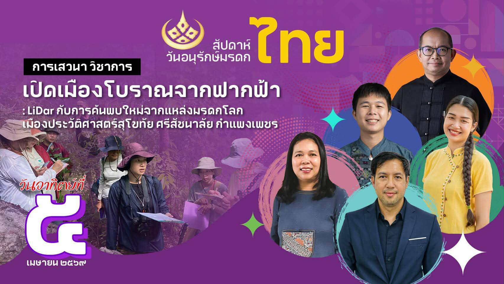 - วันที่ ๕ เมษายน เรื่อง “เปิดเมืองโบราณจากฟากฟ้า: LiDar กับการค้นพบใหม่จากแหล่งมรดกโลกเมืองประวัติศาสตร์สุโขทัย ศรีสัชนาลัย กำแพงเพชร" โดยวิทยากร ๑. นายวสันต์ เทพสุริยานนท์ ผู้อํานวยการสํานักศิลปากรที่ ๖ สุโขทัย ๒. นายสรธัช โรจนารัตน์ นักโบราณคดีชํานาญการ ๓. นายชาญชัย ศรีกัญญา นักโบราณคดีปฏิบัติการ ๔. นางสาวเมลดา มณีโชติ นักโบราณคดีปฏิบัติการ และนางสาวนาตยา ภูศรี ผู้อํานวยการกลุ่มโบราณคดี ผู้ดำเนินรายการ จัดโดยสํานักศิลปากรที่ ๖ สุโขทัย