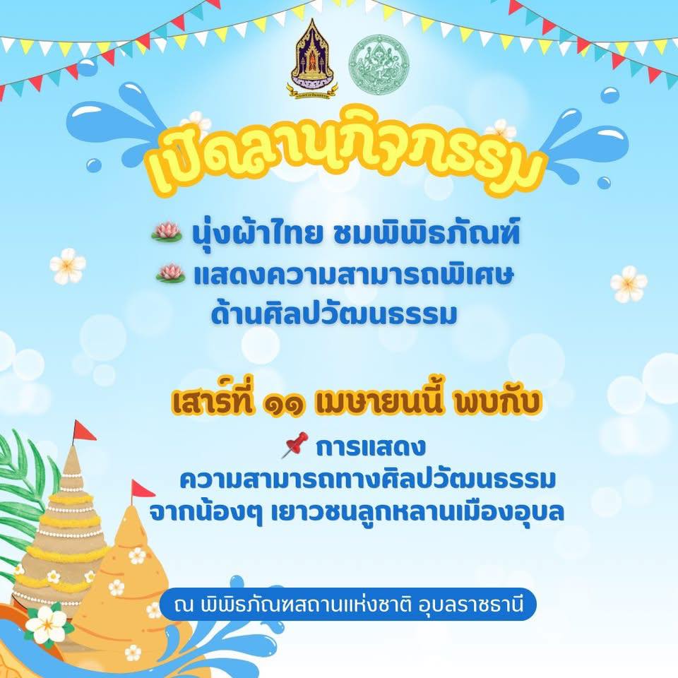 พิพิธภัณฑสถานแห่งชาติ อุบลราชธานี ขอเชิญชวนร่วมแต่งผ้าไทยชมพิพิธภัณฑ์ ในงานฮีต 12 ฮอยฮีตคองวัฒนธรรม บุญฮดสรง “สงกรานต์ ศานต์ใจ” ระหว่างวันที่ 11 - 12 เมษายน 2569 เวลา 09.00 - 16.00 น. ณ พิพิธภัณฑสถานแห่งชาติ อุบลราชธานี พบกับกิจกรรมสรงน้ำพระแบบดั้งเดิม, ตบประทาย ขนทรายเข้าวัด การสาธิตการทำน้ำอบฮดสรง, กิจกรรมงามอย่างไทย, การละเล่นพื้นบ้านแบบดั้งเดิม
