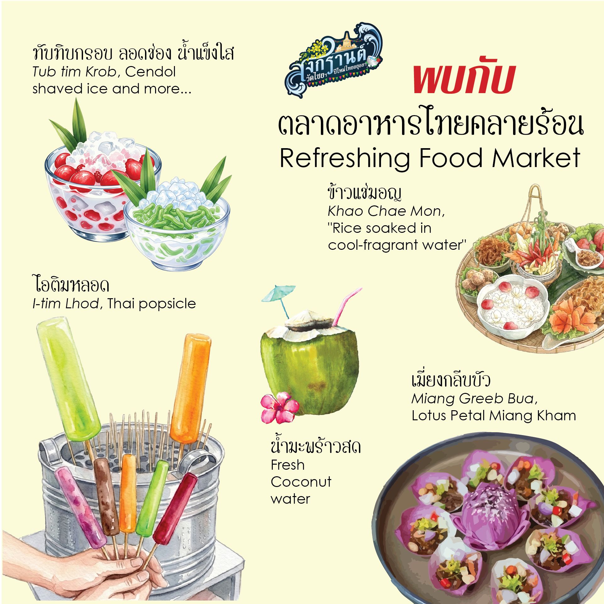 - จับจ่ายตลาดอาหารคลายร้อน อาทิ ข้าวแช่ เมี่ยงคำกลีบบัว ไอติมตัดโบราณ ไอติมหมุน ไอติมหลอดโบราณ น้ำแข็งไส ยี่สุ่นเทศ และตลาดย้อนยุคยามเย็น กว่า 100 ร้าน