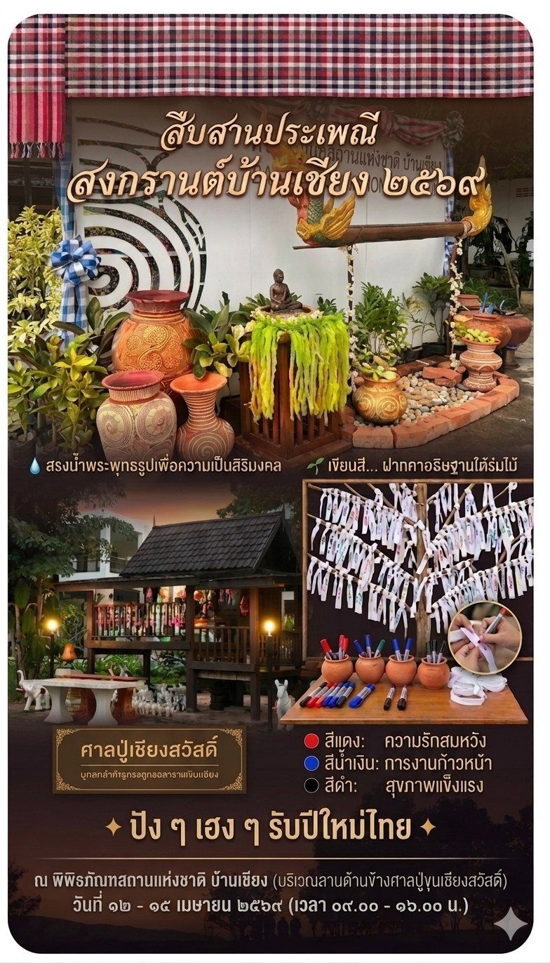 พิพิธภัณฑสถานแห่งชาติ บ้านเชียง ขอเชิญร่วมกิจกรรมสืบสานประเพณีสงกรานต์ 2569 "สรงน้ำพระ ขอพรปู่ มูรับโชคสงกรานต์" ระหว่างวันที่ 12 - 15 เมษายน 2569 ณ ลานด้านข้างศาลปู่ขุนเชียงสวัสดิ์ ภายในบริเวณพิพิธภัณฑสถานแห่งชาติ บ้านเชียง จังหวัดอุดรธานี ทุกท่านจะได้พบกับกิจกรรมพิเศษ ความลับที่ปลายผ้า... มีเพียง "50 คน" ต่อวันเท่านั้นที่จะได้รู้! ปู่แอบกระซิบมา... ใครอยากมีโชคใหญ่รับปีใหม่ไทย ต้องห้ามพลาดกิจกรรมที่บ้านเชียง! สอบถามเพิ่มเติม โทร. 0 4223 5040---------------------------------------------