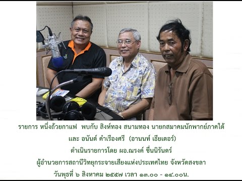 อานนท์ เธียเตอร์ สิงห์ทอง สนามทอง เเละหจช.สงขลา รับเกียรติจากคุณณรงค์ ชื่นนิรันดร์ ผู้อำนวยการ สวท.สงขลา ให้ออกรายการ หนึ่งถ้วยกาแฟ ๖ สิงหาคม ๕๗ เพื่อประชาสัมพันธ์งาน นิทรรศการเฉลิมพระเกียรติสมเด็จพระนางเจ้าสิริกิติ์พระบรมราชินีนาถ เรื่อง แม่ของเเผ่นดิน เเละ นิทรรศการภาพหนังเก่าเล่าอดีต ณ ศูนย์การค้าไดอาน่า หาดใหญ่ เเละได้ฟังความรู้เกี่ยวกับการพากย์หนัง จาก สิงห์ทอง สนามทอง สิงห์ทอง สนามทอง นายกสมาคมนักพากย์ภาคใต้
