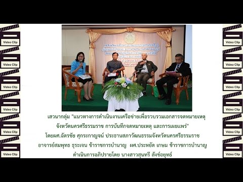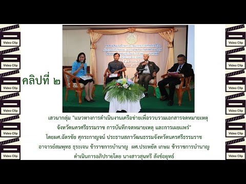 เสวนากลุ่ม “แนวทางการดำเนินงานเครือข่ายเพื่อรวบรวมเอกสารจดหมายเหตุจังหวัดนครศรีธรรมราช การบันทึกจดหมายเหตุ และการเผยแพร่” คลิป 2 โดย ผศ.ฉัตรชัย ศุกระกาญจน์ ประธานสภาวัฒนธรรมจังหวัดนครศรีธรรมราช (อดีตอธิการบดีมหาวิทยาลัยราชภัฏนครศรีธรรมราช) อ.สมพุทธ ธุระเจน ข้าราชการบำนาญ ผศ.ประหยัด เกษม ข้าราชการบำนาญ ดำเนินการอภิปรายโดย นางสาวสุนทรี สังข์อยุทธ์