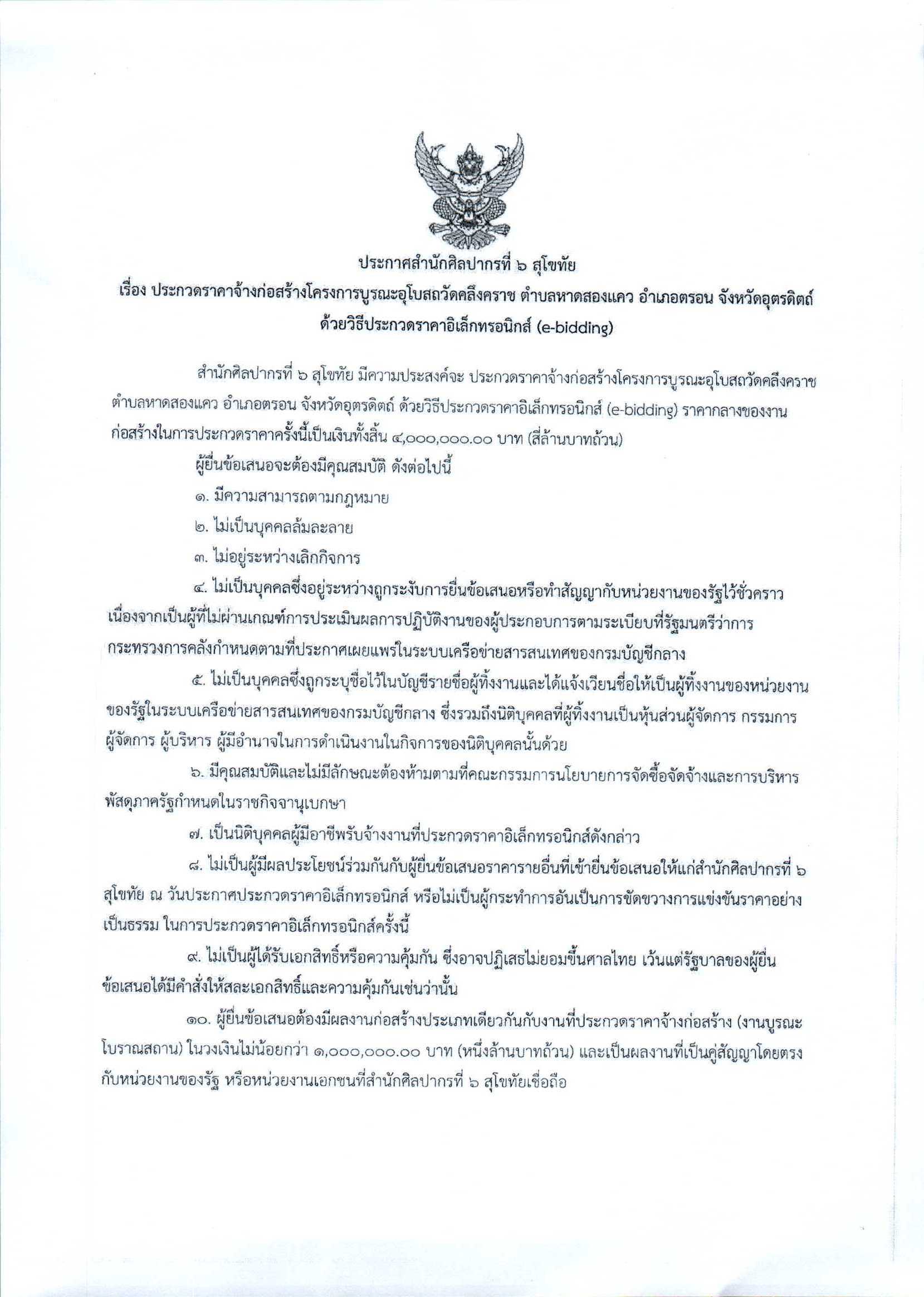 ประกาศสำนักศิลปากรที่ 6 สุโขทัย เรื่อง ประกวดราคาจ้างก่อสร้างโครงการบูรณะอุโบสถวัดคลึงคราช ตำบลหาดสองแถว อำเภอตรอน จังหวัดอุตรดิตถ์ ด้วยวิธีประกวดราคาอิเล็กทรอนิกส์ (e-bidding)