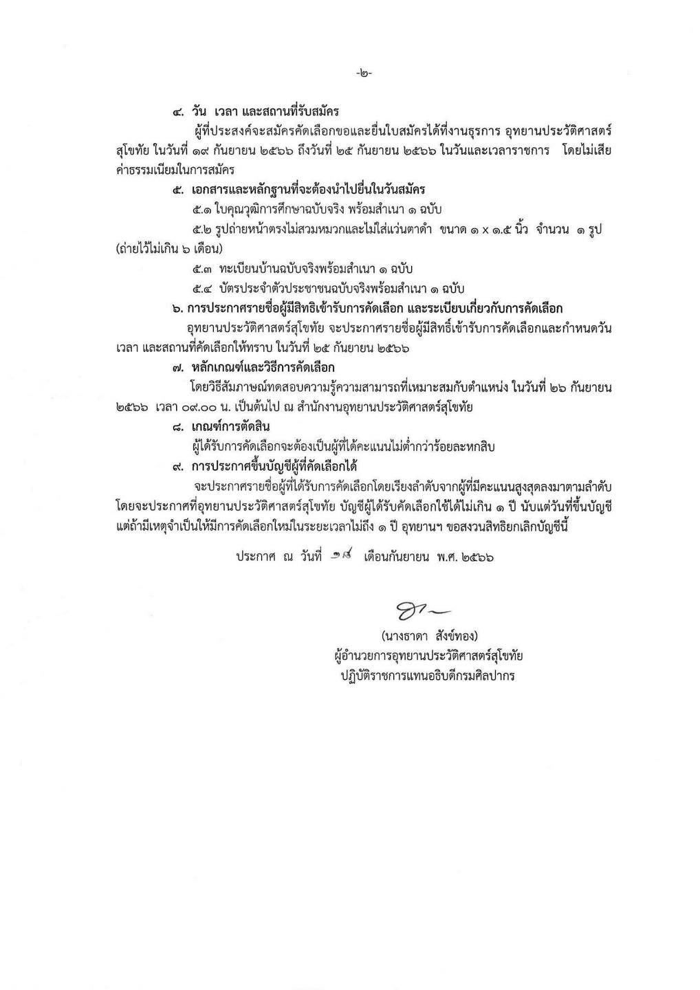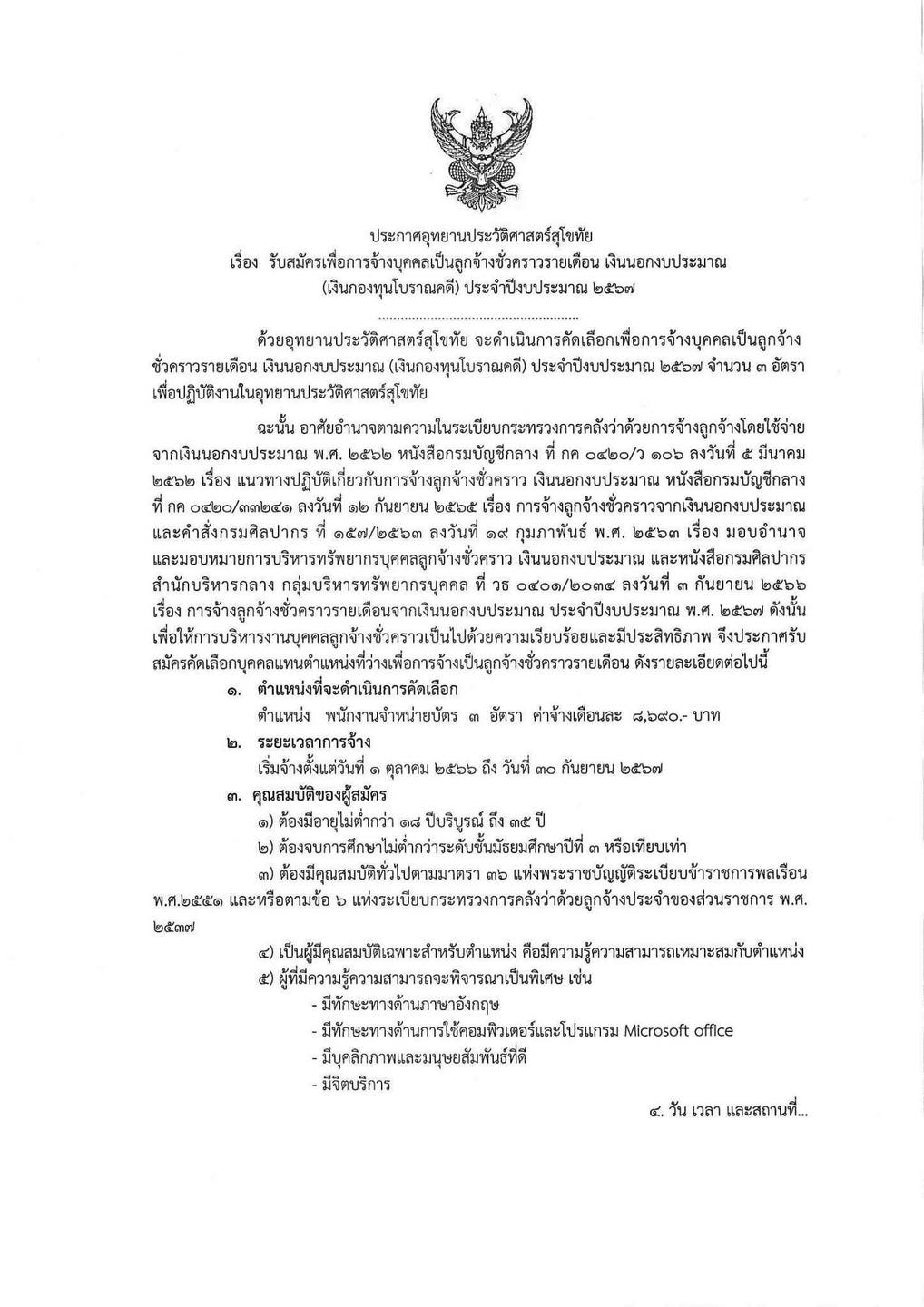 ประกาศอุทยานประวัติศาสตร์สุโขทัย เรื่อง รับสมัครเพื่อการจ้างบุคคลเป็นพนักงานเป็นลูกจ้างชั่วคราวรายเดือน เงินนอกงบประมาณ (เงินกองทุนโบราณคดี) ประจำปีงบประมาณ ๒๕๖๗